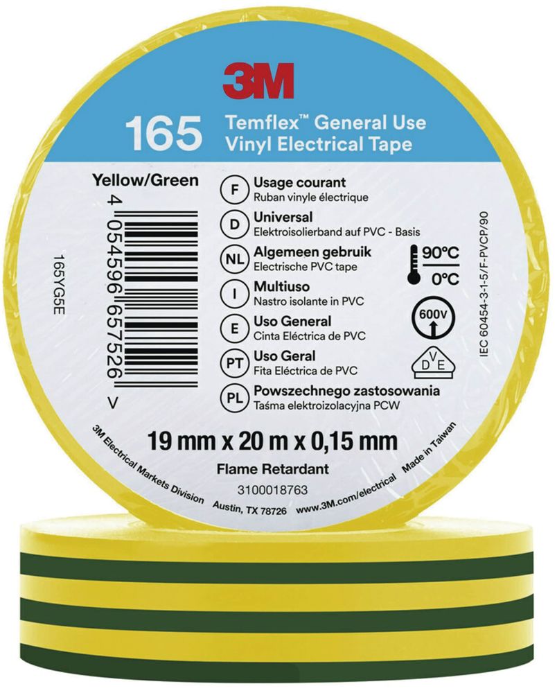 3M 165YG5E Temflex 19mmx20m Grün/Gelb Vinyl-Isolierband 0,15mm 7100222493