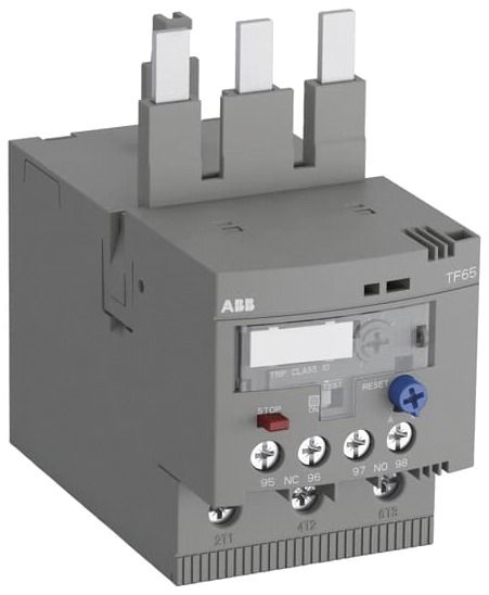TF65 werden normalerweise an Schütze AF40 bis AF65 angebaut, mit Hilfe eines Einzelaufstellung-Sets können die Geräte aber auch separat auf DIN-Schiene montiert werden. Bei Überschreitung des an der Stromskala eingestellten Motorstromes lösen die Relais über Bimetall-Elemente aus und wechseln damit die Schaltstellung der beiden Hilfskontakte 1S/1Ö. Ein vorgeschaltetes Schütz wird dadurch abgeschaltet. Die Relais erlauben manuelles oder automatisches Rücksetzen, sie verfügen über Test- und Stopp-Funktion sowie eine ausgelöst-Anzeige. Die Stromskala der Geräte ist plombierbar. Zubehör wie Rückstell-Taster und Dahtrücksteller ergänzen das Sortiment.
