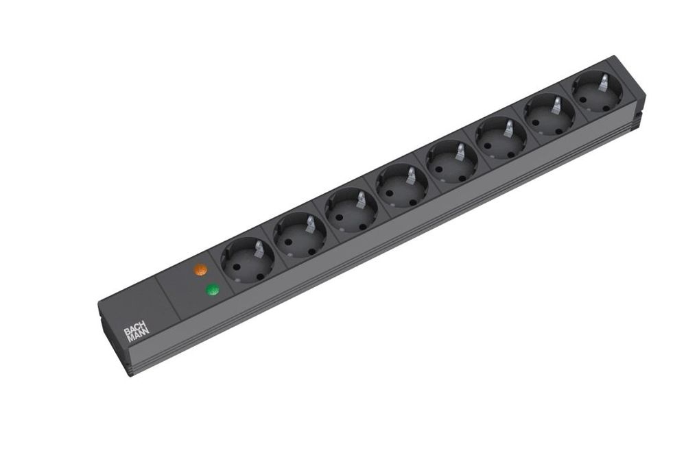 48,3 cm ( 19 Zoll ) - Steckdosenleiste ALU 1HE 8-fach Schutzkontaktsteckdosen schwarz mit Überspannungsschutz 6,5kA ( ÜSS ); Profil: ALU 1HE schwarz Länge:438,5mm; Endstücke genietet, nicht öffenbar; 2m HO5VV-F 3G1,50mm² schwarz mit Schutzkontaktsteckdosen - Winkelstecker; inkl. Befestigungswinkel mit Schrauben; im Polybeutel;