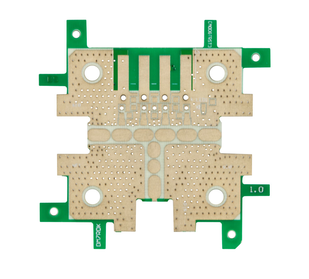 Platinenmaterial RO4350, 1.55mm stark. Die Bahnen sind nach Microstrip für 50 Ohm ausgelegt. Überbrückungen durch SMD 0805 0R Widerstände.
