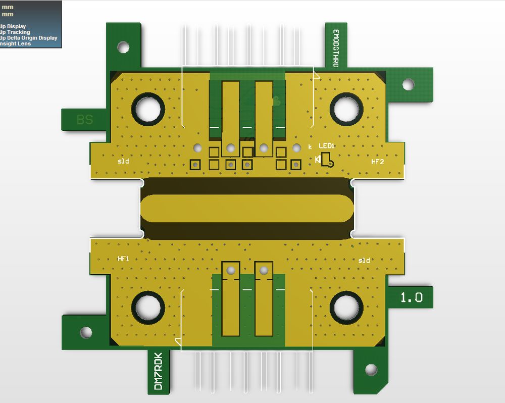 Platinenmaterial RO4350, 1.55mm stark. Die Bahnen sind nach Microstrip für 50 Ohm ausgelegt. Überbrückungen durch SMD 0805 0R Widerstände.
