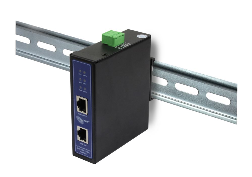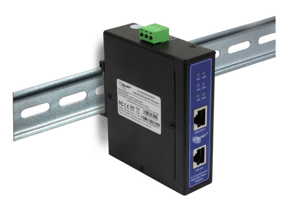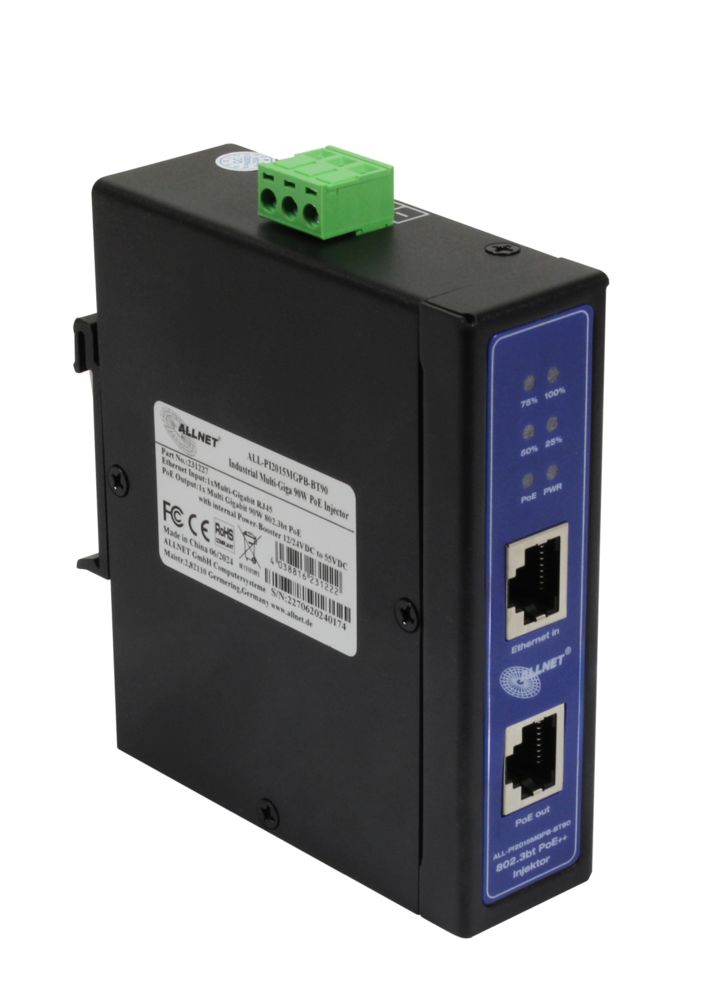 Der Artikel ALLNET PoE Injektor Industrial MultiGigabit ? PoE BT mit Power-Booster (15,4W/30W/90W) ? DIN ?ALLNET PoE Injekt Metallgehäuse ? ALL-PI2015MGPB-BT90 ist derzeit auf Lager