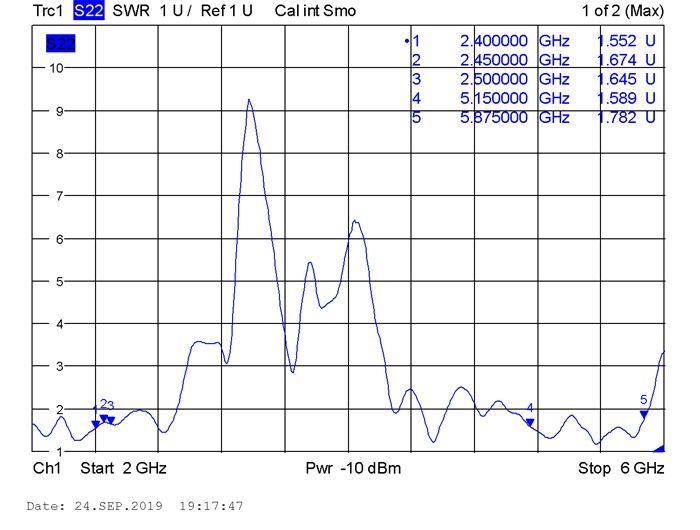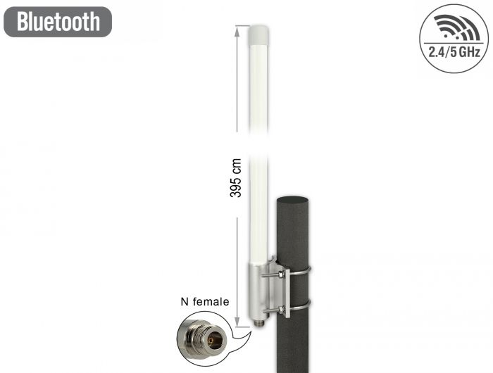 wall Suitable for indoor yes Suitable for outdoor yes Interface connector N Buchse Technical characteristics Frequency range 5150 MHz - 5875 MHz • 2400 MHz - 2500 MHz Antenna gain 6.2 - 8.0 dBi Beam width horizontal 360° Beam width vertical 17° Impedance 50 Ω Operating temperature -40 °C ~ 85 °C Polarisation linear vertical Power handling max. 100 W VSWR 2.5 Physical characteristics Antenna type omnidirectional Housing colour white Housing material GFRP Weight 297 g with mounting material Diameter 2.6 cm Length 395 mm
