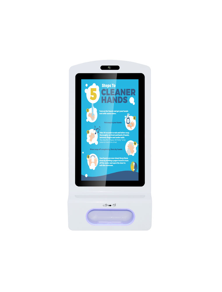 Auf dem Display kann eine Anleitung als Video zur Handdesinfektion abgespielt werden oder es können die neuesten Angebote oder Inhouse-Informationen abgespielt werden.
