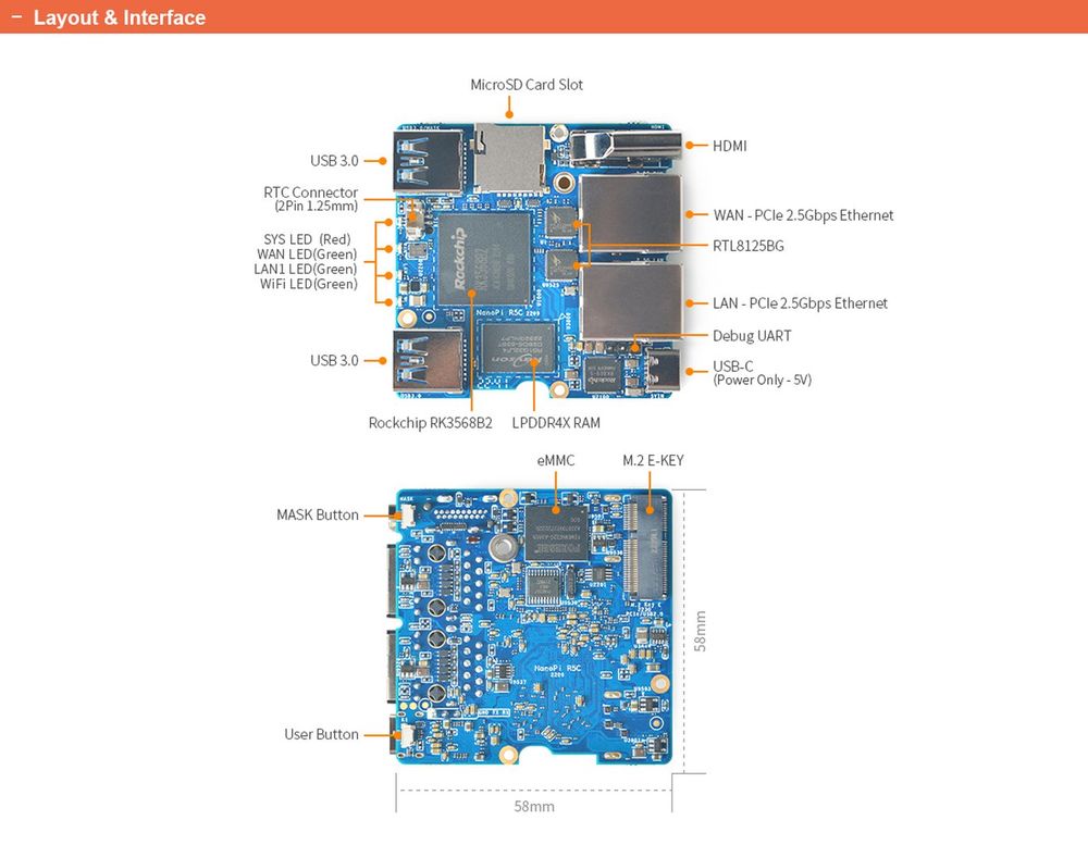 USB-C x1: Power Only(5V)Pin-header Debug: Debug UART x1, 3 Pin 2.54mm header, 3.3V level, 1500000bpsLED SYS LED(Red) x1