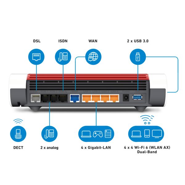 - 2x a/b-Anschlüsse für analoge Telefone, Faxgeräte oder Türsprechanlagen