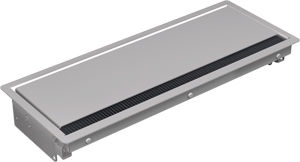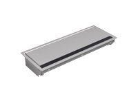 338.0205, Einbaurahmen 6-fach, zum Einbau in Arbeitsplatten, Gehäuse und Deckel Stahl gepulvert, Farbe: silbergrau, Deckel klappbar mit Endanschlag, und Rastpunkt, Bürstenleiste schwarz, Aufnahme für Steckdoseneinsatz, Zubehör: Befestigungs-Set, einzeln im Karton verpackt