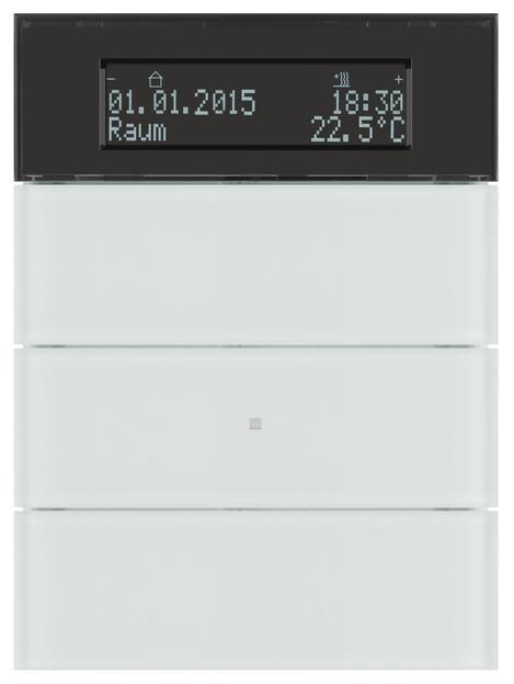 Tastsensor 3fach mit Temperaturregler und Display B.IQ Glas, polarweiß. B.IQ Tastsensor 3-fach mit Temperaturregler und Display (RTR-Display), rahmenlos, drei Wippen, mit Betriebs-LED, blau und sechs Status-LED, weiß, Display, dunkel mit weiß leuchtender Schrift, mit Demontageschutz. Unterputz-Installation. EIB-Anwendermodul zum Aufstecken auf Busankoppler plus Up über Anwenderschnittstelle (AST). Kombinationsgerät aus Tastsensor und Raumtemperaturregler mit Raumtemperaturschaltuhr sowie zwei Wochenschaltuhren, 3 Wippen zur Bedienung von Gebäudefunktionen in beliebigen Kombinationen, zweizeiliges Display mit zusätzlicher Symbolzeile, mit zwei zusätzlichen integrierten Tasten zum Einstellen und Ablesen von Raumtemperatur, Raumtemperaturschaltuhr, Wochenschaltuhren, Grundeinstellungen sowie Anzeige von Datum, Uhrzeit, Außentemperatur sowie 14 Byte Meldetexten (EIS 15). Display: Beleuchtung Ein, automatische Abschaltung, Schaltung über Objekt. Beschriftung möglich über optionale Beschriftungsfelder, Beleuchtung über Status-LED. Alarmmeldung nach Abziehen vom UP Busankoppler als 1-Bit Schaltelegramm, 1- oder 2-Byte Wertetelegramm, Bedienung sperrbar über Objekt, Tastsensor: Bedienkonzept pro Wippe als 2 Tasten (2 Objekte) oder Wippe (1 Objekt), Tastenhilfe mit Klartextanzeige, Tastenfunktionen: Schalten/Tasten, Dimmen, Einflächenbedienung (Schalten/Tasten, Dimmen, Jalousie) möglich, Jalousie, Wertgeber EIS 6 (1 Byte), Lichtszenenabruf mit/ohne Speicherfunktion, Wertgeber 2 Byte, Betriebsmodus-Umschaltung Reglerbetrieb, Schaltuhr-Bedienung. Wippenfunktionen: Schalten, Dimmen, Jalousie jeweils mit/ohne Einflächenbedienung, Betriebsmodus-Umschaltung für Reglerbetrieb. Raumtemperaturregler: Einzelraum-Temperaturregelung, Erfassung der aktuelle Raumtemperatur und Verarbeitung zu einer Stellgröße. Reglerbedienung Tasten links und rechts des Displays: Betriebsmodusumschaltung (Komfort-, Standby-, Nacht-, Frost/Hitzeschutz-Betrieb), Temperatur-Sollwerte. Betriebsarten: Heizen, Kühlen bzw. Heizen und Kühlen, Grund- und Zusatzheizen/Kühlen bzw. Grund- und Zusatzheizen und Kühlen, Regler abschaltbar (Taupunktbetrieb) bzw. Regler oder Bedienung des Reglers sperrbar, Ventilschutzfunktion. Regelungsarten: Stetige PI-Regelung, schaltende PI-Regelung (PWM) schaltende 2-Punkt-Regelung (Ein/Aus), Präsenztaste zur Komfortverlängerung parametrierbar, Temperaturerfassung über internen und/oder externen Fühler (Mittelwertbildung möglich), Stellgrößenobjekte invertierbar, Meldeobjekte für Heizen und Kühlen, Objekt für Reglerstatus, Voreingestellte Regelparameter für gängige Heiz- bzw. Kühlkörper, Separates Fensterkontakt-Objekt, Raumtemperaturschaltuhr: Zeitabhängige Verstellung der Betriebsmodi Komfort-, Standby-, Nacht-Betrieb, Wochenprogramm, max. 28 Schaltzeiten, Sperrung über Objekt. Wochenschaltuhren: Funktion Schalten, Wertgeber 1 Byte, Lichtszenen-Nebenstelle, max. 14 Schaltzeiten, Sperrung der Schaltuhren über Objekt.