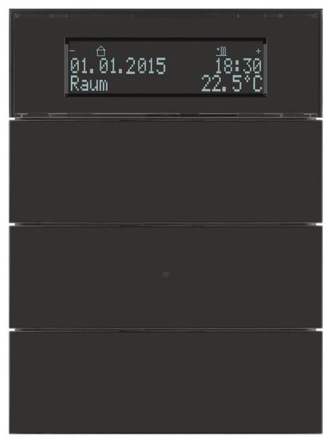 Tastsensor 3fach mit Temperaturregler und Display B.IQ Glas, schwarz. B.IQ Tastsensor 3-fach mit Temperaturregler und Display (RTR-Display), rahmenlos, drei Wippen, mit Betriebs-LED, blau und sechs Status-LED, weiß, Display, dunkel mit weiß leuchtender Schrift, mit Demontageschutz. Unterputz-Installation. KNX-Anwendermodul zum Aufstecken auf Busankoppler plus Up über Anwenderschnittstelle (AST). Kombinationsgerät aus Tastsensor und Raumtemperaturregler mit Raumtemperaturschaltuhr sowie zwei Wochenschaltuhren, 3 Wippen zur Bedienung von Gebäudefunktionen in beliebigen Kombinationen, zweizeiliges Display mit zusätzlicher Symbolzeile, mit zwei zusätzlichen integrierten Tasten zum Einstellen und Ablesen von Raumtemperatur, Raumtemperaturschaltuhr, Wochenschaltuhren, Grundeinstellungen sowie Anzeige von Datum, Uhrzeit, Außentemperatur sowie 14 Byte Meldetexten (EIS 15). Display: Beleuchtung Ein, automatische Abschaltung, Schaltung über Objekt. Beschriftung möglich über optionale Beschriftungsfelder, Beleuchtung über Status-LED. Alarmmeldung nach Abziehen vom UP Busankoppler als 1-Bit Schaltelegramm, 1- oder 2-Byte Wertetelegramm, Bedienung sperrbar über Objekt, Tastsensor: Bedienkonzept pro Wippe als 2 Tasten (2 Objekte) oder Wippe (1 Objekt), Tastenhilfe mit Klartextanzeige, Tastenfunktionen: Schalten/Tasten, Dimmen, Einflächenbedienung (Schalten/Tasten, Dimmen, Jalousie) möglich, Jalousie, Wertgeber EIS 6 (1 Byte), Lichtszenenabruf mit/ohne Speicherfunktion, Wertgeber 2 Byte, Betriebsmodus-Umschaltung Reglerbetrieb, Schaltuhr-Bedienung. Wippenfunktionen: Schalten, Dimmen, Jalousie jeweils mit/ohne Einflächenbedienung, Betriebsmodus-Umschaltung für Reglerbetrieb. Raumtemperaturregler: Einzelraum-Temperaturregelung, Erfassung der aktuelle Raumtemperatur und Verarbeitung zu einer Stellgröße. Reglerbedienung Tasten links und rechts des Displays: Betriebsmodusumschaltung (Komfort-, Standby-, Nacht-, Frost/Hitzeschutz-Betrieb), Temperatur-Sollwerte. Betriebsarten: Heizen, Kühlen bzw. Heizen und Kühlen, Grund- und Zusatzheizen/Kühlen bzw. Grund- und Zusatzheizen und Kühlen, Regler abschaltbar (Taupunktbetrieb) bzw. Regler oder Bedienung des Reglers sperrbar, Ventilschutzfunktion. Regelungsarten: Stetige PI-Regelung, schaltende PI-Regelung (PWM) schaltende 2-Punkt-Regelung (Ein/Aus), Präsenztaste zur Komfortverlängerung parametrierbar, Temperaturerfassung über internen und/oder externen Fühler (Mittelwertbildung möglich), Stellgrößenobjekte invertierbar, Meldeobjekte für Heizen und Kühlen, Objekt für Reglerstatus, Voreingestellte Regelparameter für gängige Heiz- bzw. Kühlkörper, Separates Fensterkontakt-Objekt, Raumtemperaturschaltuhr: Zeitabhängige Verstellung der Betriebsmodi Komfort-, Standby-, Nacht-Betrieb, Wochenprogramm, max. 28 Schaltzeiten, Sperrung über Objekt. Wochenschaltuhren: Funktion Schalten, Wertgeber 1 Byte, Lichtszenen-Nebenstelle, max. 14 Schaltzeiten, Sperrung der Schaltuhren über Objekt.