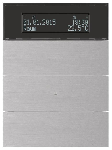 Tastsensor 3fach mit Temperaturregler und Display B.IQ Alu. B.IQ Tastsensor 3-fach mit Temperaturregler und Display (RTR-Display), rahmenlos, drei Wippen, mit Betriebs-LED, blau und sechs Status-LED, weiß, Display, dunkel mit weiß leuchtender Schrift, mit Demontageschutz. Unterputz-Installation. EIB-Anwendermodul zum Aufstecken auf Busankoppler plus Up über Anwenderschnittstelle (AST). Kombinationsgerät aus Tastsensor und Raumtemperaturregler mit Raumtemperaturschaltuhr sowie zwei Wochenschaltuhren, 3 Wippen zur Bedienung von Gebäudefunktionen in beliebigen Kombinationen, zweizeiliges Display mit zusätzlicher Symbolzeile, mit zwei zusätzlichen integrierten Tasten zum Einstellen und Ablesen von Raumtemperatur, Raumtemperaturschaltuhr, Wochenschaltuhren, Grundeinstellungen sowie Anzeige von Datum, Uhrzeit, Außentemperatur sowie 14 Byte Meldetexten (EIS 15). Display: Beleuchtung Ein, automatische Abschaltung, Schaltung über Objekt. Beschriftung möglich über optionale Beschriftungsfelder, Beleuchtung über Status-LED. Alarmmeldung nach Abziehen vom UP Busankoppler als 1-Bit Schaltelegramm, 1- oder 2-Byte Wertetelegramm, Bedienung sperrbar über Objekt, Tastsensor: Bedienkonzept pro Wippe als 2 Tasten (2 Objekte) oder Wippe (1 Objekt), Tastenhilfe mit Klartextanzeige, Tastenfunktionen: Schalten/Tasten, Dimmen, Einflächenbedienung (Schalten/Tasten, Dimmen, Jalousie) möglich, Jalousie, Wertgeber EIS 6 (1 Byte), Lichtszenenabruf mit/ohne Speicherfunktion, Wertgeber 2 Byte, Betriebsmodus-Umschaltung Reglerbetrieb, Schaltuhr-Bedienung. Wippenfunktionen: Schalten, Dimmen, Jalousie jeweils mit/ohne Einflächenbedienung, Betriebsmodus-Umschaltung für Reglerbetrieb. Raumtemperaturregler: Einzelraum-Temperaturregelung, Erfassung der aktuelle Raumtemperatur und Verarbeitung zu einer Stellgröße. Reglerbedienung Tasten links und rechts des Displays: Betriebsmodusumschaltung (Komfort-, Standby-, Nacht-, Frost/Hitzeschutz-Betrieb), Temperatur-Sollwerte. Betriebsarten: Heizen, Kühlen bzw. Heizen und Kühlen, Grund- und Zusatzheizen/Kühlen bzw. Grund- und Zusatzheizen und Kühlen, Regler abschaltbar (Taupunktbetrieb) bzw. Regler oder Bedienung des Reglers sperrbar, Ventilschutzfunktion. Regelungsarten: Stetige PI-Regelung, schaltende PI-Regelung (PWM) schaltende 2-Punkt-Regelung (Ein/Aus), Präsenztaste zur Komfortverlängerung parametrierbar, Temperaturerfassung über internen und/oder externen Fühler (Mittelwertbildung möglich), Stellgrößenobjekte invertierbar, Meldeobjekte für Heizen und Kühlen, Objekt für Reglerstatus, Voreingestellte Regelparameter für gängige Heiz- bzw. Kühlkörper, Separates Fensterkontakt-Objekt, Raumtemperaturschaltuhr: Zeitabhängige Verstellung der Betriebsmodi Komfort-, Standby-, Nacht-Betrieb, Wochenprogramm, max. 28 Schaltzeiten, Sperrung über Objekt. Wochenschaltuhren: Funktion Schalten, Wertgeber 1 Byte, Lichtszenen-Nebenstelle, max. 14 Schaltzeiten, Sperrung der Schaltuhren über Objekt.