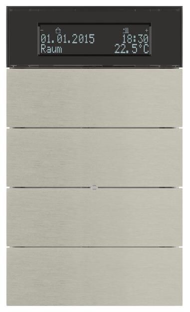 Tastsensor 4fach mit Temperaturregler und Display B.IQ Edelstahl Rostfrei. KNX Systembeschreibung Das KNX System ist ein flexibles, aufwärtskompatibles Installationsbussystem (früher EIB = European Installation Bus) für den Einsatz in der Gebäudesystemtechnik. Es ist speziell zugeschnitten auf besondere Anforderungen bezüglich des Komforts, der Möglichkeit zur flexiblen Raumnutzung, der Kombination von zentraler und dezentraler Steuerung, der intelligenten Verknüpfung von Gewerken und Systemen, Kommunikationsmöglichkeiten, Umweltverträglichkeit, der Energie- und Betriebskostenminimierung sowie der Funktionen Anzeigen, Melden, Bedienen, Überwachen und Detektieren. Durch seinen dezentralen Aufbau ermöglicht es in Wohn- und Zweckbauten, unabhängig von der Anlagengröße, ein gebäudespezifisches Betriebsmanagement. Besonders vorteilhaft wirkt sich die Verwendbarkeit von handelsüblichen Stromkreisverteilern und Installationsdosen aus. Alle Busteilnehmer werden über eine den KNX-Richtlinien (Konnex Association) entsprechende Busleitung (z.B. J-Y(St)Y 2x2x0,8) verbunden. Da die Busleitung, nach DIN VDE 0100, direkt neben