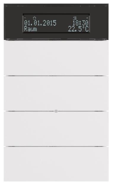 Tastsensor 4fach mit Temperaturregler und Display B.IQ polarweiß, matt. B.IQ Tastsensor 4-fach mit Temperaturregler und Display (RTR-Display), rahmenlos, vier Wippen, mit Betriebs-LED, blau und acht Status-LED, weiß, Display, dunkel mit weiß leuchtender Schrift, mit Demontageschutz. Unterputz-Installation. EIB-Anwendermodul zum Aufstecken auf Busankoppler plus Up über Anwenderschnittstelle (AST). Kombinationsgerät aus Tastsensor und Raumtemperaturregler mit Raumtemperaturschaltuhr sowie zwei Wochenschaltuhren, 4 Wippen zur Bedienung von Gebäudefunktionen in beliebigen Kombinationen, zweizeiliges Display mit zusätzlicher Symbolzeile, mit zwei zusätzlichen integrierten Tasten zum Einstellen und Ablesen von Raumtemperatur, Raumtemperaturschaltuhr, Wochenschaltuhren, Grundeinstellungen sowie Anzeige von Datum, Uhrzeit, Außentemperatur sowie 14 Byte Meldetexten (EIS 15). Display: Beleuchtung Ein, automatische Abschaltung, Schaltung über Objekt. Beschriftung möglich über optionale Beschriftungsfelder, Beleuchtung über Status-LED. Alarmmeldung nach Abziehen vom UP Busankoppler als 1-Bit Schaltelegramm, 1- oder 2-Byte Wertetelegramm, Bedienung sperrbar über Objekt, Tastsensor: Bedienkonzept pro Wippe als 2 Tasten (2 Objekte) oder Wippe (1 Objekt), Tastenhilfe mit Klartextanzeige, Tastenfunktionen: Schalten/Tasten, Dimmen, Einflächenbedienung (Schalten/Tasten, Dimmen, Jalousie) möglich, Jalousie, Wertgeber EIS 6 (1 Byte), Lichtszenenabruf mit/ohne Speicherfunktion, Wertgeber 2 Byte, Betriebsmodus-Umschaltung Reglerbetrieb, Schaltuhr-Bedienung. Wippenfunktionen: Schalten, Dimmen, Jalousie jeweils mit/ohne Einflächenbedienung, Betriebsmodus-Umschaltung für Reglerbetrieb. Raumtemperaturregler: Einzelraum-Temperaturregelung, Erfassung der aktuelle Raumtemperatur und Verarbeitung zu einer Stellgröße. Reglerbedienung Tasten links und rechts des Displays: Betriebsmodusumschaltung (Komfort-, Standby-, Nacht-, Frost/Hitzeschutz-Betrieb), Temperatur-Sollwerte. Betriebsarten: Heizen, Kühlen bzw. Heizen und Kühlen, Grund- und Zusatzheizen/Kühlen bzw. Grund- und Zusatzheizen und Kühlen, Regler abschaltbar (Taupunktbetrieb) bzw. Regler oder Bedienung des Reglers sperrbar, Ventilschutzfunktion. Regelungsarten: Stetige PI-Regelung, schaltende PI-Regelung (PWM) schaltende 2-Punkt-Regelung (Ein/Aus), Präsenztaste zur Komfortverlängerung parametrierbar, Temperaturerfassung über internen und/oder externen Fühler (Mittelwertbildung möglich), Stellgrößenobjekte invertierbar, Meldeobjekte für Heizen und Kühlen, Objekt für Reglerstatus, Voreingestellte Regelparameter für gängige Heiz- bzw. Kühlkörper, Separates Fensterkontakt-Objekt, Raumtemperaturschaltuhr: Zeitabhängige Verstellung der Betriebsmodi Komfort-, Standby-, Nacht-Betrieb, Wochenprogramm, max. 28 Schaltzeiten, Sperrung über Objekt. Wochenschaltuhren: Funktion Schalten, Wertgeber 1 Byte, Lichtszenen-Nebenstelle, max. 14 Schaltzeiten, Sperrung der Schaltuhren über Objekt.