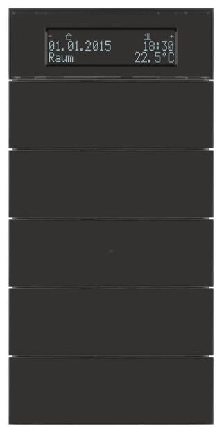 Tastsensor 5fach mit Temperaturregler und Display B.IQ Glas, schwarz. B.IQ Tastsensor 5-fach mit Temperaturregler und Display (RTR-Display), rahmenlos, fünf Wippen, mit Betriebs-LED, blau und zehn Status-LED, weiß, Display, dunkel mit weiß leuchtender Schrift, mit Demontageschutz. Unterputz-Installation. EIB-Anwendermodul zum Aufstecken auf Busankoppler plus Up über Anwenderschnittstelle (AST). Kombinationsgerät aus Tastsensor und Raumtemperaturregler mit Raumtemperaturschaltuhr sowie zwei Wochenschaltuhren, 5 Wippen zur Bedienung von Gebäudefunktionen in beliebigen Kombinationen, zweizeiliges Display mit zusätzlicher Symbolzeile, mit zwei zusätzlichen integrierten Tasten zum Einstellen und Ablesen von Raumtemperatur, Raumtemperaturschaltuhr, Wochenschaltuhren, Grundeinstellungen sowie Anzeige von Datum, Uhrzeit, Außentemperatur sowie 14 Byte Meldetexten (EIS 15). Display: Beleuchtung Ein, automatische Abschaltung, Schaltung über Objekt. Beschriftung möglich über optionale Beschriftungsfelder, Beleuchtung über Status-LED. Alarmmeldung nach Abziehen vom UP Busankoppler als 1-Bit Schaltelegramm, 1- oder 2-Byte Wertetelegramm, Bedienung sperrbar über Objekt, Tastsensor: Bedienkonzept pro Wippe als 2 Tasten (2 Objekte) oder Wippe (1 Objekt), Tastenhilfe mit Klartextanzeige, Tastenfunktionen: Schalten/Tasten, Dimmen, Einflächenbedienung (Schalten/Tasten, Dimmen, Jalousie) möglich, Jalousie, Wertgeber EIS 6 (1 Byte), Lichtszenenabruf mit/ohne Speicherfunktion, Wertgeber 2 Byte, Betriebsmodus-Umschaltung Reglerbetrieb, Schaltuhr-Bedienung. Wippenfunktionen: Schalten, Dimmen, Jalousie jeweils mit/ohne Einflächenbedienung, Betriebsmodus-Umschaltung für Reglerbetrieb. Raumtemperaturregler: Einzelraum-Temperaturregelung, Erfassung der aktuelle Raumtemperatur und Verarbeitung zu einer Stellgröße. Reglerbedienung Tasten links und rechts des Displays: Betriebsmodusumschaltung (Komfort-, Standby-, Nacht-, Frost/Hitzeschutz-Betrieb), Temperatur-Sollwerte. Betriebsarten: Heizen, Kühlen bzw. Heizen und Kühlen, Grund- und Zusatzheizen/Kühlen bzw. Grund- und Zusatzheizen und Kühlen, Regler abschaltbar (Taupunktbetrieb) bzw. Regler oder Bedienung des Reglers sperrbar, Ventilschutzfunktion. Regelungsarten: Stetige PI-Regelung, schaltende PI-Regelung (PWM) schaltende 2-Punkt-Regelung (Ein/Aus), Präsenztaste zur Komfortverlängerung parametrierbar, Temperaturerfassung über internen und/oder externen Fühler (Mittelwertbildung möglich), Stellgrößenobjekte invertierbar, Meldeobjekte für Heizen und Kühlen, Objekt für Reglerstatus, Voreingestellte Regelparameter für gängige Heiz- bzw. Kühlkörper, Separates Fensterkontakt-Objekt, Raumtemperaturschaltuhr: Zeitabhängige Verstellung der Betriebsmodi Komfort-, Standby-, Nacht-Betrieb, Wochenprogramm, max. 28 Schaltzeiten, Sperrung über Objekt. Wochenschaltuhren: Funktion Schalten, Wertgeber 1 Byte, Lichtszenen-Nebenstelle, max. 14 Schaltzeiten, Sperrung der Schaltuhren über Objekt.