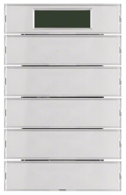 Tastsensor 5fach mit RTR, Display K.5 alu. Tastsensor 5-fach mit Raumtemperaturregler, Display zur Vorortbedienung von Schalt-, Tast-, Dimm-, Jalousie-, Raumtemperaturreglerfunktionen, mit Demontageschutz, mit weißer Betriebs- und zehn roten Status-LED, LC-Display mit Symboldarstellung, Tasten vollflächig beschriftbar, mit 2 zusätzlichen Display-Tasten zur Programmierung über Display, zum Aufstecken auf Busankoppler Up. Applikationseigenschaften: Displaymenüumfang für Bedienung parametrierbar, Anzeige von Betriebsart, Reglersperrung, Raum-, Außentemperatur, Uhrzeit (Zeitgeber erforderlich), Betriebs-LED schaltbar über Objekt Alarmtelegramm nach Abziehen von Busankoppler 1 Bit oder 1 Byte. Tastsensorfunktionen: Schalt-, Tast-, Dimm-, Jalousiefunktionen programmierbar, Funktion 2 Telegramme programmierbar, Wertgeber für Dimm-, Helligkeits- und Temperaturwerte 1 und 2 Byte, Nebenstelle für Lichtszenentastsensor, zyklisches Senden auch über Nebenstelle möglich, Tasten oder Wippen parametrierbar, Einflächenbedienung für Schalten, Tasten, Jalousie und Dimmen, Bereichsdimmen, Jalousie Bedienkonzepte Kurz-Lang-Kurz und Lang-Kurz parametrierbar, Wippen oder Tastsensor über Objekt sperrbar. Raumtemperaturregelfunktion: mit Raumtemperaturschaltuhr. Für individuelle Einzelraumregelung, Reglerbetriebsarten Komfort-, Standby-, Nacht- und Frost-/Hitzeschutz-Betrieb. Für Heiz- und/oder Kühlbetrieb mit/ohne Zusatzstufe, Regelparameter für Heiz- bzw. Kühlkörper voreingestellt. Für stetige oder schaltende Regelung von max. 2 Regelkreisen, Temperaturmessung über internen und/oder externen Fühler mit Mittelwertbildung, Präsenztaste zur Komfortverlängerung auf Tastsensor programmierbar, Tastsensor-Tasten als Reglernebenstelle sowie zur Betriebsmodusumschaltung, Sollwertverschiebung, Raumtemperaturschaltuhrbedienung programmierbar, separates Fensterkontakt-Objekt, Meldeobjekte für Heizen und Kühlen, mit Ventilschutzfunktion, Objekt für Reglerstatus. Unterputz-Installation, Flächenprogramm. Material: Kunststoff, Thermoplast, bruchsicher, hochglänzende Oberfläche, halogenfrei.