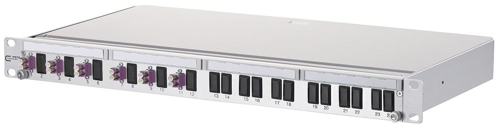 . Varianten: bestückt mit 6, 12 oder 24 LC-D Kupplungen und Pigtails jeweils in blau (OS2), grün (OS2 APC), erikaviolett (OM4), aqua (OM3) oder beige (OM2)