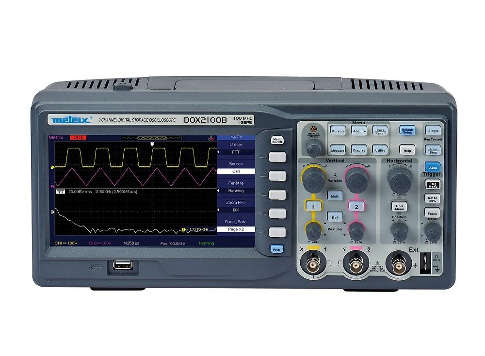 Das METRIX DOX2100B ist ein digitales Tisch-Oszilloskop mit hoher Leistung und einfacher Bedienung in einem kompakten, platzsparenden Gehäuse, das speziell für den Einsatz im Labor entwickelt wurde. Mit zwei Kanälen und einer Bandbreite bis zu 100 MHz ermöglicht das DOX2100B präzise Signalaufzeichnungen und umfassende Analysen. Die maximale Abtastrate beträgt 500 MS/s bei zwei Kanälen und 1 GS/s bei einem Kanal im Single Shot Modus, und bis zu 50 GS/s im Wiederholungsmodus.