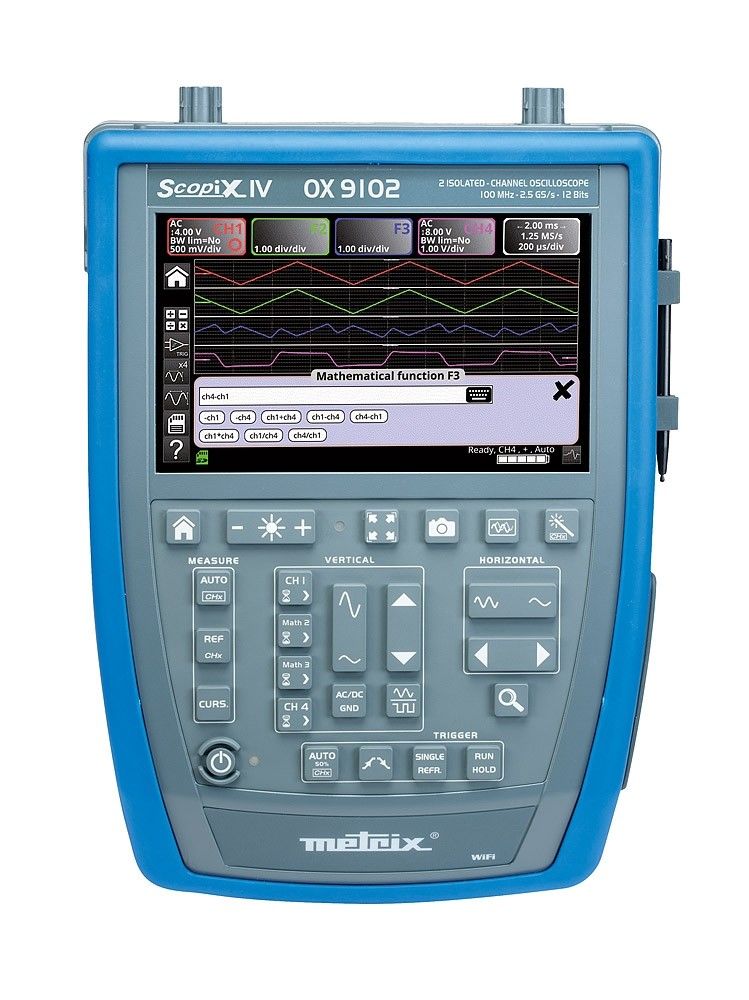 Das OX 9102 ist ein tragbares, netzunabhängiges Digitaloszilloskop der Serie SCOPIX IV der Generation Tablet-Icons mit 2 völlig isolierten Kanälen bis 600 V und mit 100 MHz Bandbreite. Die Speichertiefe in jedem Kanal beträgt 100 KPunkte, was lange Signalaufzeichnungen ermöglicht.