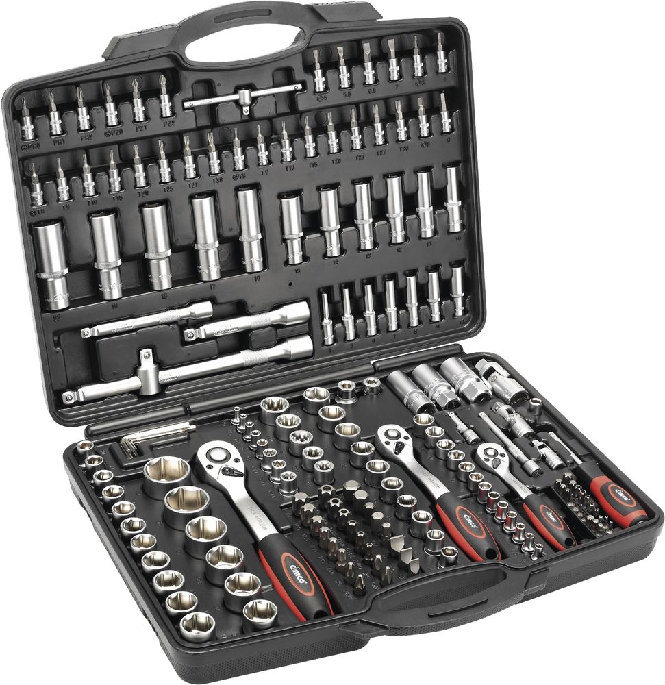 Steckschlüssel-Satz 171-teilig, aus Chrom-Vanadium-Stahl, in einer stabilen Kunststoffbox, Antrieb 6,3 mm (1/4'), 10 mm (3/8') und 12,5 mm (1/2'). Einsätze in Sechskant für ein maximales Drehmoment. Mit 6,3 mm (1/4') Antrieb: Sechskanteinsatz 4-4,5-5-5,5-6-7-8-9-10-11-12-13-14 mm, Sechskanteinsatz extra lang 4-5 6-7-8-9-10 mm, Verlängerung in 50 und 100 mm, Steckschlüsseleinsatz, E-Profil E4-E5-E6-E7-E8, für TX T8-T9-T10-T15-T20-T25-T27-T30, für TX mit Bohrung: T8-T9-T10-T15-T20-T25-T27-T30, Kreuzeinsatz Pozidriv PZ0-PZ1-PZ2, , Innensechskant-Einsatz 3-4-5-6 mm, Schlitzeinsatz 4-5,5-6,5-7 mm, Kreuzeinsatz Phillips PH0-PH1-PH2, Kardangelenk, Handgriff 150 mm, Umschaltknarre 145 mm, 72 Zähne feinverzahnt, Quergriff mit Gleitkopf 1/4'110 mm, Adapter für 6,3 mm Bits, Mit 10 mm (3/8') Antrieb: Sechkanteinsatz 10-11-12-13-14-15-16-17-18-19 mm, Sechskanteinsatz extra lang 10-11-12-13-14-15 mm, Steckschlüsseleinsatz, E-Profil E10-E11-E12-E14-E16-E18, Verlängerung 125 mm, Umschaltknarre 205 mm, 72 Zähne feinstverzahnt, Zündkerzeneinsatz 18 mm, Kardangelenk, Adapter für 8 mm Bits, Mit 12,5 mm (1/2') Antrtieb: Sechskanteinsatz 10 - 11 - 12 - 13 - 14 - 15 - 16- 17 - 18- 19 - 20 - 21 - 22 - 24 - 27 - 30 - 32 mm, Sechskanteinsatz extra lang 16 - 17 - 18 - 19 - 22 mm, Steckschlüsseleinsatz, E-Profil E20 - E24, Zündkerzeneinsatz 16 - 21 mm, Verlängerung 125 mm, Umschaltknarre 250 mm, 72 Zähne feinstverzahnt, Quergriff mit Gleitkopf 1/2'250 mm, Kardangelenk, Adapter für 8 mm Bits, Schraubendrehbits in 8 mm Antrieb x30 mmLänge: für TX-Schrauben T40 - T45 - T50 - T55 - T60 - T70, für TX-Schrauben mit Bohrung T40 - T45 - T50 - T55 - T60 - T70 , . Innensechskant-Einsatz 7 - 8 - 10 - 12 - 14 mm, . Kreuzeinsatz Phillips PH 3 - PH 4, . Schlitzeinsatz 8 - 10 - 12 mm, . Kreuzeinsatz Pozidriv PZ 3 - PZ 4, Schraubendrehbits in 6,3 mm (1/4') Antrieb x 25 mm Länge: . Vielzahn-Einsatz M5 - M6 - M8, . für TX-Schrauben T5 - T6 - T7, . für TX-Schrauben mit Bohrung T7, RB-Profil-Einsatz M5 - M6- M7 - M8 - M9, . Fünfstern-Einsatz TS10 - TS15 - TS20 - TS25 - TS27 - TS30 -??TS40 - TS45, Innensechskant-Winkelschlüssel: . 1,27 - 1,5 - 2 - 2,5 - 3 - 4 - 5 mm