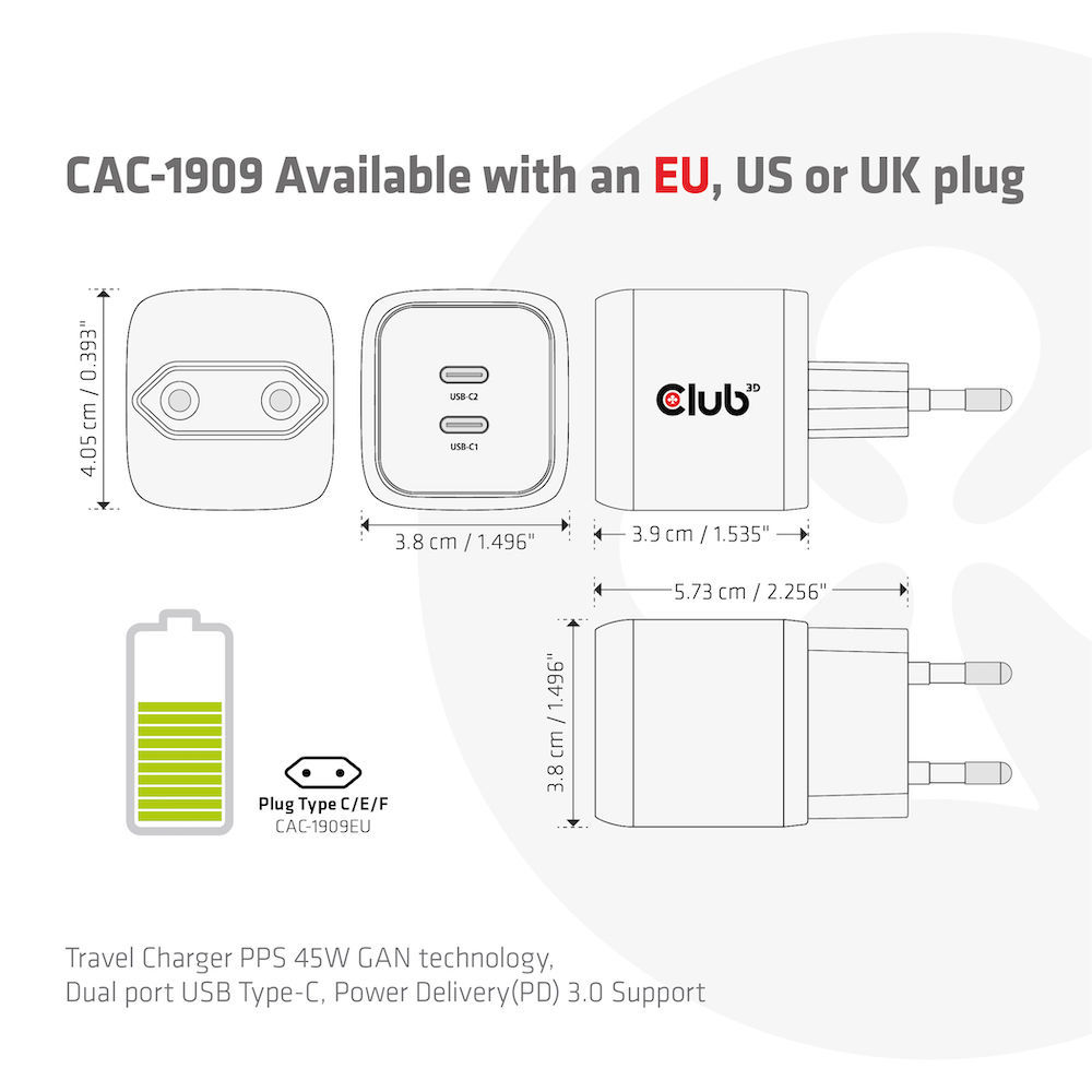 Der Artikel Club 3D Reiseladegerät PPS 45W GAN-Technologie, Dualer Anschluss USB Typ-C, Power Delivery(PD) 3.0 Unterstützung *schwarz* ist derzeit nicht auf Lager und muss auftragsbezogen bestellt werden.
