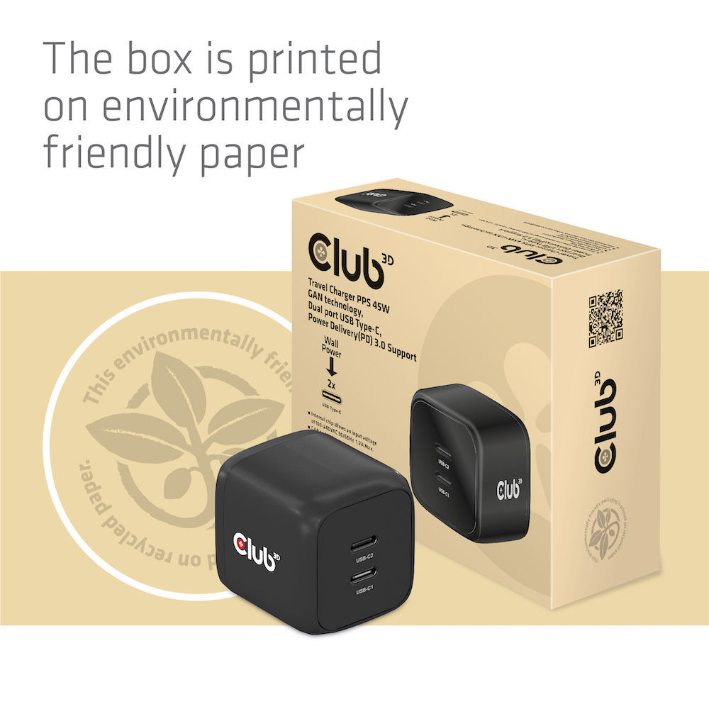 Club 3D Reiseladegerät PPS 45W GAN-Technologie, Dualer Anschluss USB Typ-C, Power Delivery(PD) 3.0 Unterstützung *schwarz*