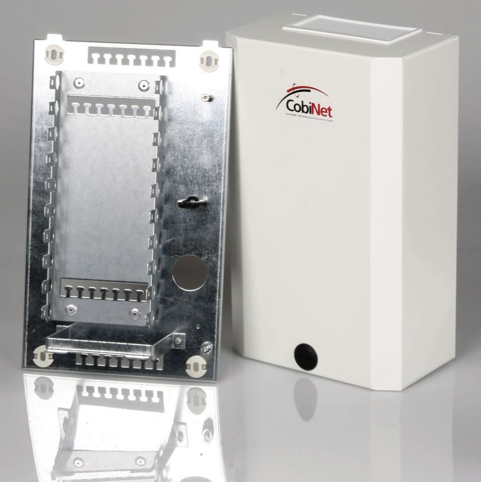 Für max. 10 LSA-Leisten 2/10, AP verschließbar, Grundplatte aus Stahlblech mit Montagewanne, Haube aus pulverbeschichtetem Blech mit Kabeleinführungen oben/unten