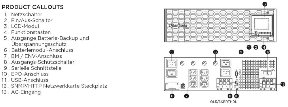 OL6KERTHDL, inkl. RMCARD205 SNMP-Karte, *Auftragsbezogen, nicht Stornierbar* Abmasse: H130/B433/T720mm, Laufzeit: 10,4/3,1min(halb/voll-Last) CyberPower OL6KERTHDL garantiert hochwertigsten Backup-Schutz für IT-Geräte, Server, Workstations, NAS / Speichergeräte, Telekommunikationsgeräte, Netzwerkgeräte, Sicherheits- / Notfallsysteme und Überwachungssysteme. Die USV verwendet die Doppelwandlertopologie, um eine hochwertige dauerhafte Versorgung und dies in sehr kompakter Form bereitzustellen Die USV ist generatorkompatibel, verfügt über Hot-Swap-fähige Akkus für eine Wartung ohne Unterbrechung der Stromversorgung. Daneben verfügt sie über einen ECO-Modus, der es erlaubt den Stromkreis zu optimieren und so den Stromverbrauch zu reduzieren und Energiekosten zu sparen. An die USV lassen sich externe Batterieerweiterungen (EBM), um die Laufzeiten zu verlängern, anschießen. Für eine optimale Batterielebensdauer verwendet die USV unsere patentierte Batterie-Management-Technologie, bei der die Batteriespannung der einzelnen Batterien angeglichen werden. Durch das neigbares LCD-Farbdisplay können Benutzer die wichtigsten Informationen zur Stromversorgung und Batterie auf einen Blick überwachen. Mit der PowerPanel Power Management Software können Benutzer die USV in Echtzeit überwachen, fernsteuern oder Shutdowns von Serrvern realisieren. Merkmale Online (Doppelwandler) USV Topologie Extra Kompaktes Design Hoher Ausgangsleistungsfaktor Kippbares LCD-Panel Überspannungs- und Blitzschutz Generator Kompatibel Hot-Swap-fähige Batterien Intelligentes Batteriemanagement (SBM) SNMP / HTTP-Fernverwaltungsfähigkeit ECO Betrieb LCD-Farbdisplay Schnell-Aufladetechnologie Automatisch drehbares LCD Kritische / nicht kritische Ausgänge Batterie-Management-Technologie Externe Batterieerweiterung (EBM) Notausschaltung (EPO) Anschluss PowerPanel Verwaltungssoftware https://www.cyberpower.com/de/de/product/sku/OL6KERTHDL#runtime_chart