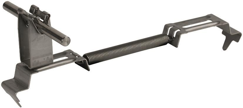 Dachleitungshalter SPANNgrip zum Befestigen von Fangleitungen auf dem Firstziegel z. B. bei Ziegeldächer. Mit Befestigung durch NIRO-Zugfeder mit Leitungshalter DEHNgrip, lose Leitungsführung, seitlich verstellbar.