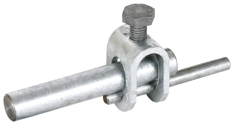 Stangenklemme nach DIN EN 62561-1, zum Verbinden von Fangstangen Rd 16 mm mit Rundleitern. Ausführung für der Anschluss längs oder quer.