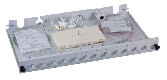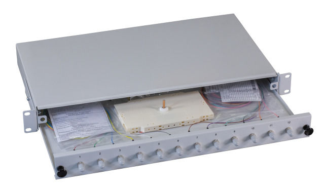 LWL-Patchpanel Spleisbox,48,3 cm ( 19 Zoll ), 12xST, 50/125um,ausziehbar,OM4, Vorkonfektioniert,