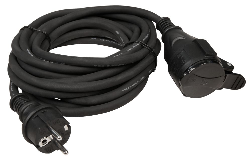- Stromverlängerungskabel aus einer schweren Gummischlauchleitung mit Schutzkappe