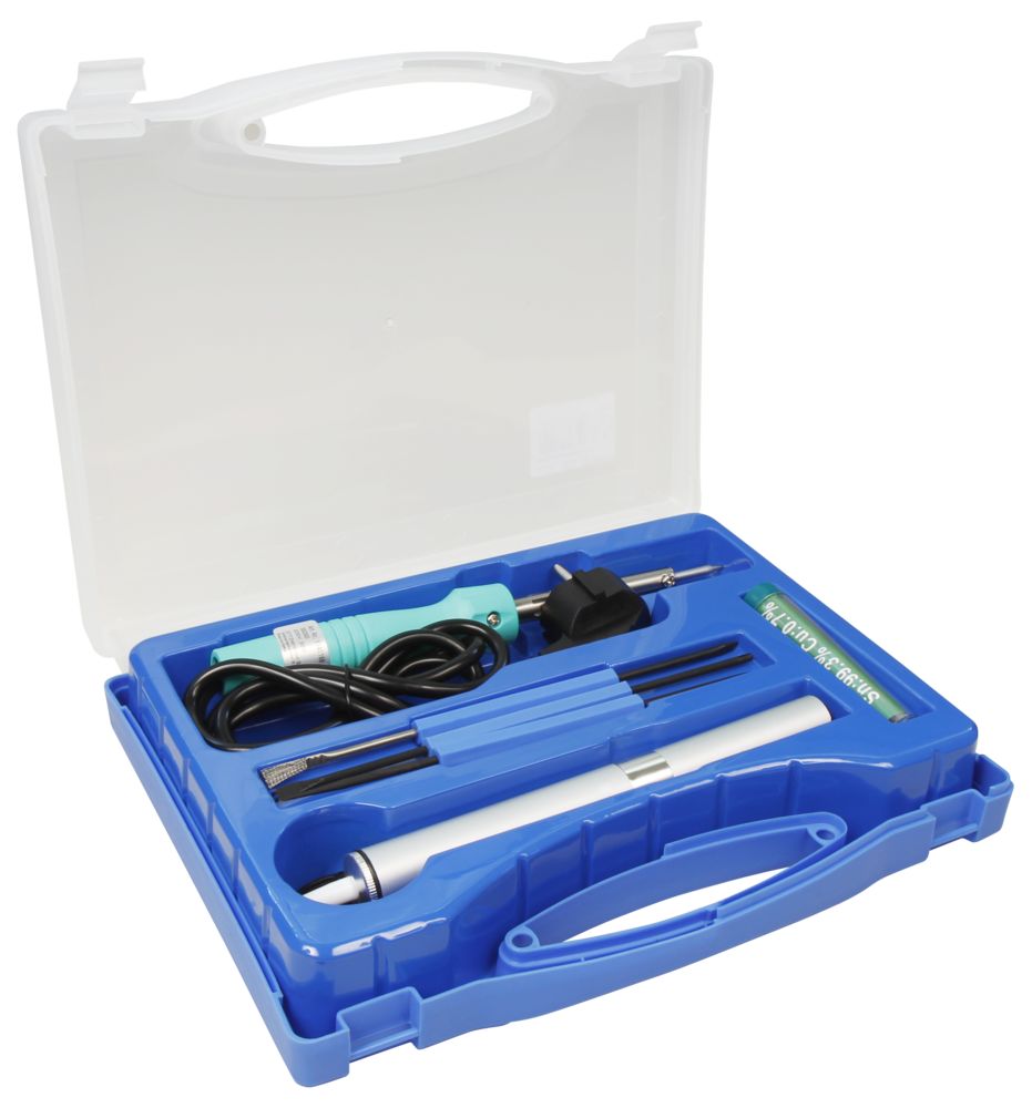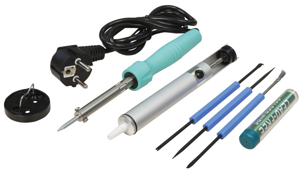 - beinhaltet Lötkolben (230 V / 30 W), Entlötsaugpumpe, 3 Stück zweifach Entlöt- < Löthebel, Lötkolbenablage und Lötzinn