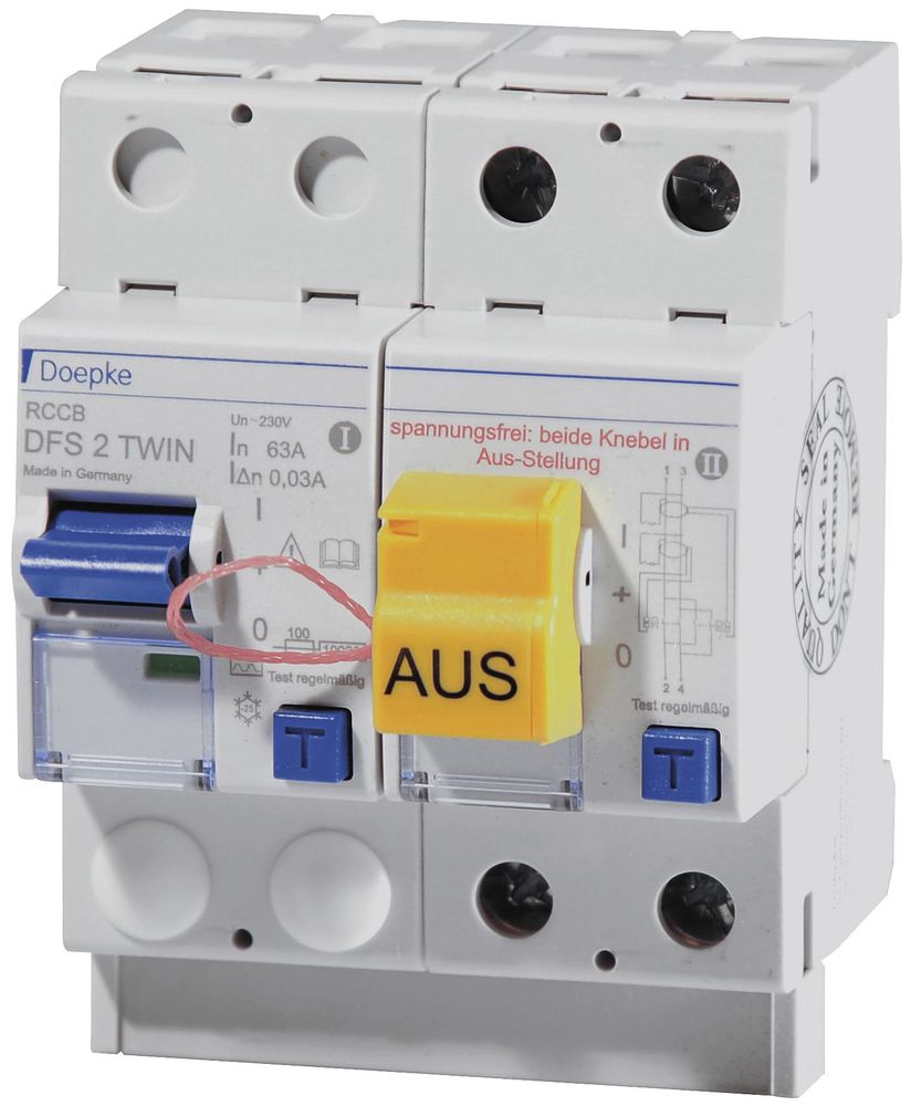Fehlerstromschutzschalter (RCCB) schalten die Stromversorgung ab, wenn gefährlich hohe Fehlerströme auftreten. Sie schützen so Personen, Tiere und Anlagen. DFS 2 sind zweipolige Fehlerstromschutzschalter für einphasige Netze. In Standardausführung sind die kompakten Geräte zwei Teilungseinheiten schmal. Sie sind mit vielen verschiedenen Fehlerstromtypen und Ausführungen bei Bemessungsströmen bis zu 125 A erhältlich. Die großen Doppelstockklemmen können auch große Leiterquerschnitte aufnehmen. Die Ausgelöststellung des Multifunktionsschaltknebel erleichtert die Fehlersuche. Die kostenlose Etikettensoftware hilft bei der Beschriftung. Die Twin-Ausführung ermöglicht den Funktionstest des Fehlerstromschutzschalters, ohne den Stromkreis abzuschalten. In dieser Ausführung sind zwei vollständige RCCB kombiniert: Sind beide Geräte eingeschaltet, kann ein Schalter mittels Prüftaste ausgelöst werden. Der zweite FI übernimmt die Stromführung und die Schutzfunktion. Schalter des Typs A sind puls- und wechselstromsensitiv. Diese Funktion ist netzspannungsunabhängig. Geräte in Standardausführung sind für die Überwachung von Stromkreisen mit einer Bemessungsspannung von 230 V und einer Bemessungsfrequenz von 50 Hz ausgelegt. Eigenschaften: Funktionstest des Fehlerstromschutzschalters ohne Stromunterbrechung, normgerechter Fehlerstromschutz auch während der Testprozedur, keine Kosten durch Anlagenstillstand, hohe Anlagenverfügbarkeit, netz- und hilfsspannungsunabhängige Auslösung, sensitiv für Wechsel- und pulsierende Gleichfehlerströme (Typ A) geringe Baugröße für alle Bemessungsströme, hohe Kurzschlussfestigkeit, beidseitige Doppelstockklemmen für großen Leiterquerschnitt und Schienenanschluss, Schaltstellungsanzeige, Sichtfenster für Beschriftungsetiketten, Multifunktionsschaltknebel mit drei Positionen: 'ein', 'aus', 'ausgelöst', Montageart: Schnellbefestigung auf Tragschiene, Einbaulage beliebig, Einspeiserichtung beliebig, Einsatzgebiete: Stromversorgungen von Wohn- und Zweckgebäuden sowie Industrieanlagen mit TN-S-, TT- und TN-C-S-Netzen. In IT-Netzen können Fehlerstromschutzschalter dieser Baureihe zur Abschaltung im Falle eines zweiten Fehlers vorgesehen werden, Die Twin-Ausführung ermöglicht die Durchführung des regelmäßig vorgeschriebenen Funktionstests ohne Stromunterbrechung, somit ideal für Labor- oder IT-Bereiche, Ausgeschlossen ist der Einsatz in TN-C-Netzen und zum Schutz von Anlagen. in denen elektronische Betriebsmittel glatte Gleichfehlerströme oder Fehlerströme mit Frequenzen ungleich 50 Hz verursachen können, Hinweise: Wiedereinschaltsperre WES 2 werksseitig montiert.
