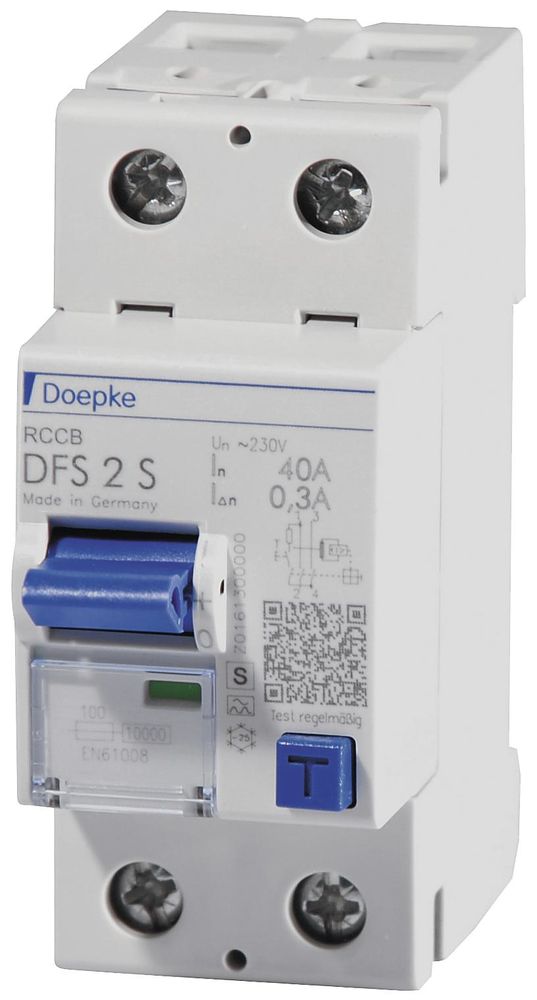 Fehlerstromschutzschalter (RCCB) schalten die Stromversorgung ab, wenn gefährlich hohe Fehlerströme auftreten. Sie schützen so Personen, Tiere und Anlagen. DFS 2 sind zweipolige Fehlerstromschutzschalter für einphasige Netze. In Standardausführung sind die kompakten Geräte zwei Teilungseinheiten schmal. Sie sind mit vielen verschiedenen Fehlerstromtypen und Ausführungen bei Bemessungsströmen bis zu 125 A erhältlich. Die großen Doppelstockklemmen können auch große Leiterquerschnitte aufnehmen. Die Ausgelöststellung des Multifunktionsschaltknebel erleichtert die Fehlersuche. Die kostenlose Etikettensoftware hilft bei der Beschriftung. Schalter des Typs A sind puls- und wechselstromsensitiv. Diese Funktion ist netzspannungsunabhängig. Selektive Fehlerstromschutzschalter kommen in Anlagen mit gestaffelten Verteilungen zum Einsatz. Im Fehlerfall löst nur der Schalter aus, in dessen Anlagenabschnitt der Fehlerstrom vorliegt. Die selektiven RCCB bieten Brand- und Fehlerschutz (bei indirektem Berühren), nicht aber den zusätzlichen Schutz (direktes Berühren, Personenschutz). Geräte in Standardausführung sind für die Überwachung von Stromkreisen mit einer Bemessungsspannung von 230 V und einer Bemessungsfrequenz von 50 Hz ausgelegt. Eigenschaften: Ansprechverzögerung für selektive Ausführung, hohe Immunität gegen Stoßfehlerströme und netzspannungsgetriebene Folgestromimpulse, netz- und hilfsspannungsunabhängige Auslösung, sensitiv für Wechsel- und pulsierende Gleichfehlerströme (Typ A) geringe Baugröße für alle Bemessungsströme, hohe Kurzschlussfestigkeit, beidseitige Doppelstockklemmen für großen Leiterquerschnitt und Schienenanschluss, Schaltstellungsanzeige, Sichtfenster für Beschriftungsetiketten, Multifunktionsschaltknebel mit drei Positionen: 'ein', 'aus', 'ausgelöst', Anschluss C1 Neutralleiterposition beliebig, Montageart: Schnellbefestigung auf Tragschiene, Einbaulage beliebig, Einspeiserichtung beliebig, Einsatzgebiete: Hauptverteilungen in weit ausgedehnten Stromversorgungen mit TN-S-, TT- und TN-C-S-Systemen, z. B. für Campingplätze, Yachthäfen, Kleingartenkolonien, Schaustellplätze. Selektive Fehlerstromschutzschalter schützen hier die Kabel von der Hauptverteilung zu den Unterverteilungen, Ausgeschlossen ist der Einsatz in TN-C-Netzen und zum Schutz von Anlagen, in denen elektronische Betriebsmittel glatte Gleichfehlerströme oder Fehlerströme mit Frequenzen ungleich 50 Hz verursachen können. Hier ist ein umfassender Schutz nicht gegeben. Für solche Anwendungen empfehlen wir unsere allstromsensitiven Fehlerstromschutzschalter (Typ B oder B+), Hinweise: Um Selektivität des RCCB zu gewährleisten. muss der Bemessungsfehlerstrom des selektiven RCCB mindestens eine Stufe höher gewählt werden als der des nachgeschalteten unverzögerten Schalters.