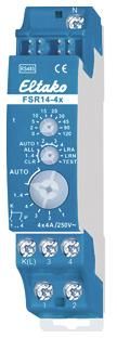 Stromstoß-Schaltrelais mit 4 Kanälen, je 1 Schließer 4A/250V AC, 230V-LED-Lampen bis 200W, Glühlampen 1000W, potenzialgetrennt von der Versorgungsspannung, mit DX-Technologie. Bidirektional. Stand-by-Verlust nur 0,1 Watt. Reiheneinbaugerät für Montage auf Tragschiene DIN-EN 60715 TH35. 1 Teilungseinheit = 18mm breit, 58mm tief. Anschluss an den Eltako-RS485-Bus. Querverdrahtung Bus und Stromversorgung mit Steckbrücke. Mit der patentierten Eltako-Duplex-Technologie können die normalerweise potenzialfreien Kontakte beim Schalten von 230V-Wechselspannung 50Hz trotzdem im Nulldurchgang schalten und damit den Verschleiß drastisch reduzieren. Hierzu einfach den N-Leiter an die Klemme (N) und L an K(L) anschließen. Dadurch ergibt sich ein zusätzlicher Stand-by-Verlust von nur 0,1 Watt. Sind alle 4 Relais des FSR14-4x eingeschaltet, werden 0,7 Watt benötigt. Beim Ausfall der Versorgungsspannung wird definiert ausgeschaltet. Die Kanäle können unabhängig voneinander als ES- und/oder ER-Kanal eingelernt werden. Szenen-Steuerung: Mit einem der vier Steuersignale eines als Szenentaster eingelernten Tasters mit Doppelwippe können mehrere Kanäle eines oder mehrerer FSR14-4x zu je einer Szene ein- bzw. ausgeschaltet werden. Zentralbefehle können mit Funktastern und/oder mit einem Professional Smart Home-Controller gesendet werden. Mit den Drehschaltern werden die Taster eingelernt und gegebenenfalls die 4 Kanäle getestet. Für den Normalbetrieb werden der mittlere und der untere Drehschalter anschließend auf AUTO gestellt. Bei dem oberen Drehschalter wird ggf. für alle Kanäle gleich die EW-Zeit (0-120 Sekunden) für Relais bzw. die RV-Zeit (0-120 Minuten) für Stromstoßschalter eingestellt. Werden Funk-Bewegungs-Helligkeitssensoren FBH (Master) und / oder FBH (Slave) eingelernt, wird mit dem oberen Drehschalter, für jeden Kanal getrennt, die Schaltschwelle festgelegt, bei welcher die Beleuchtung einschaltet bzw. ausschaltet. Einstellungen des oberen Drehschalters gemäß Bedienungsanleitung. Werden Funk-Helligkeitssensoren eingelernt, wird mit dem oberen Drehschalter, für jeden Kanal getrennt, die Schaltschwelle festgelegt, bei welcher in Abhängigkeit von der Helligkeit die Beleuchtung einschaltet bzw. ausschaltet (von ca. 0