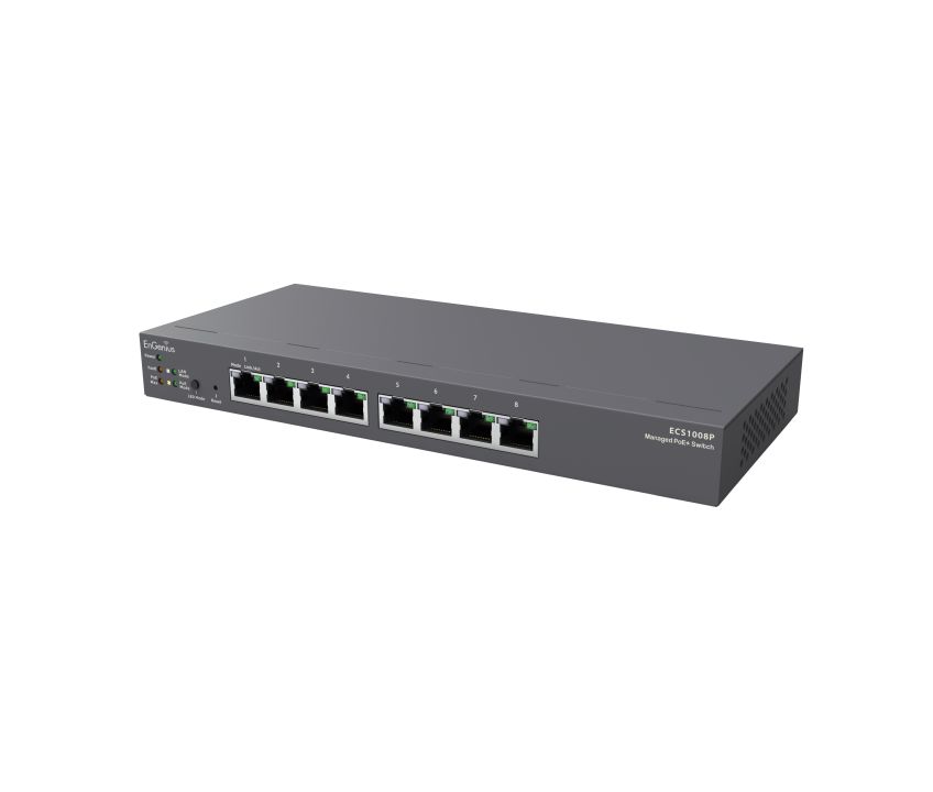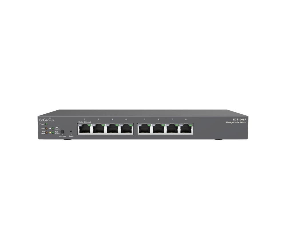 EnGenius Switch full managed Layer2+ 8 Port ? 8x 1 GbE ? PoE Budget 55W ? 8x PoE af ? Desktop Switch ? Lüfterlos ? ECS1008P ? EnGenius Cloud