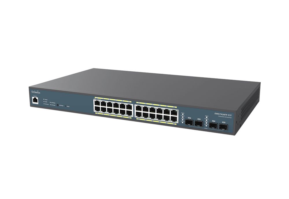 EnGenius Switch full managed Layer 2+ 28 Port ? 24x 1 GbE ? PoE Budget 410W ? 24x PoE at ? 4x SFP ? 48,3 cm ( 19 Zoll ) ? EWS7928FP-FIT ? FitCon/FitXpress