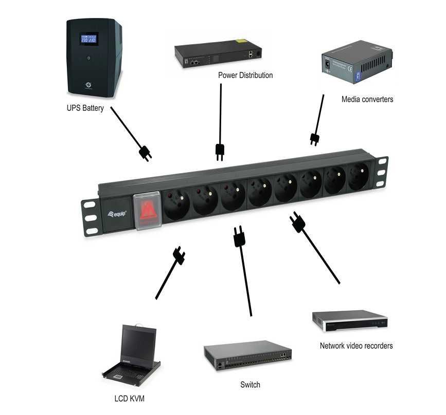 Der Artikel Equip 48,3 cm ( 19 Zoll ) Steckdosenleiste CEE7/7 90°->8xNFC 61-314 FR Pla. ist derzeit auf Lager