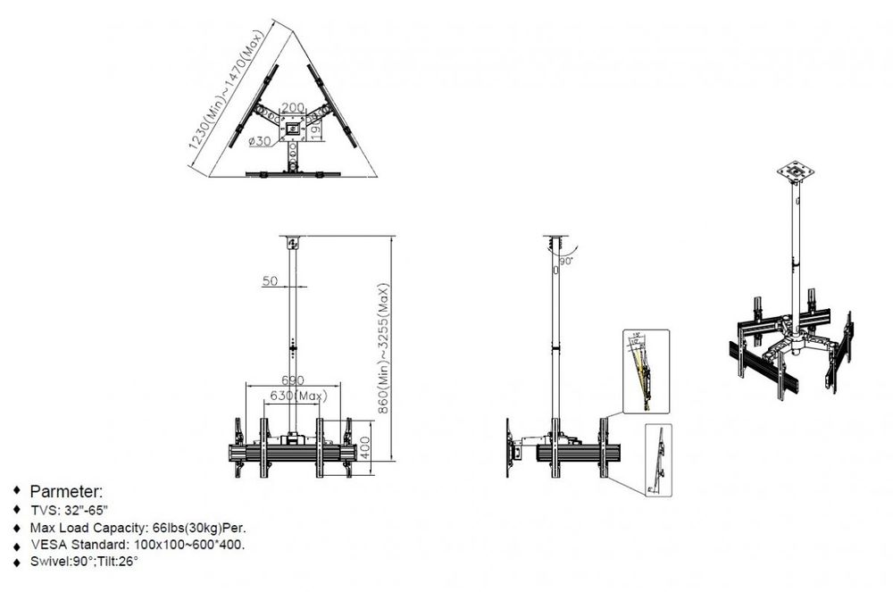Equip Deckenhalterung 81,3 cm ( 32 Zoll )-165,1 cm ( 65 Zoll )/3TFT 30Kg 2Gelenke schwarz lite Retail