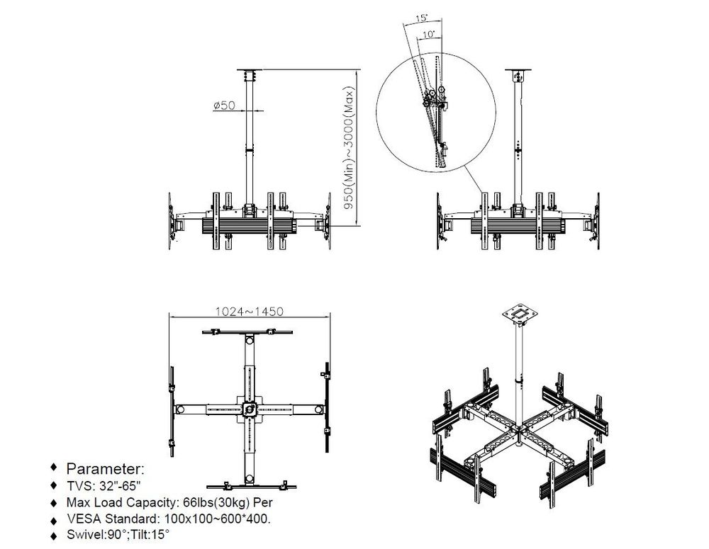 Equip Deckenhalterung 81,3 cm ( 32 Zoll )-165,1 cm ( 65 Zoll )/4TFT 30Kg 2Gelenke schwarz lite Retail (Speditionsversand)