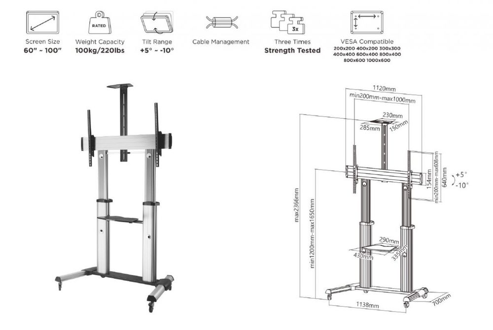 Equip Bodenstandhalter 152,4 cm ( 60 Zoll )-254 cm ( 100 Zoll )/ 1TFT 100kg 2Ablagen schwarz lite Retail