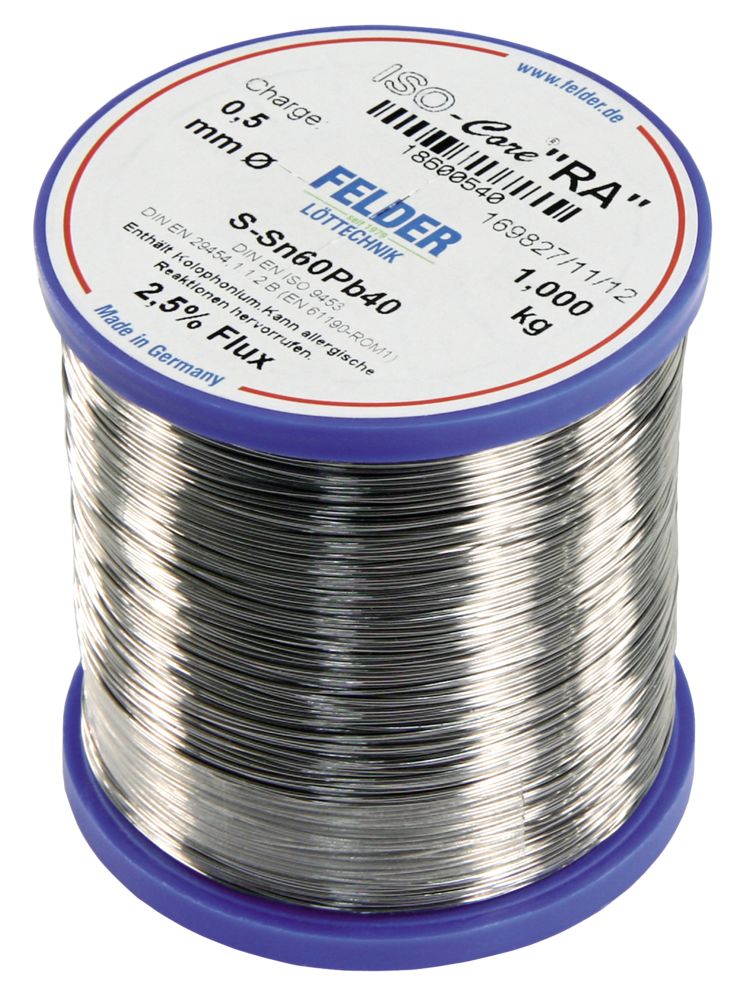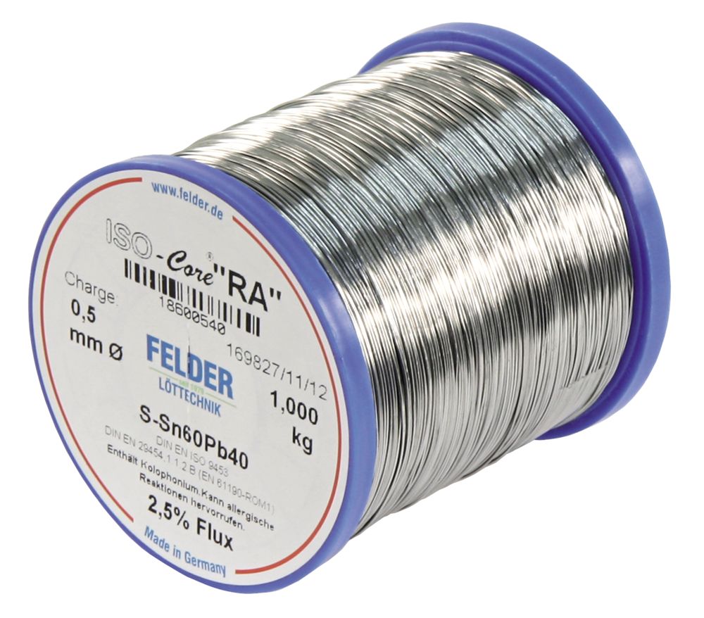 Der Artikel Felder Löttechnik ETT-1540247 Lötzinn auf Rolle FELDER ISO-Core ''RA'', 0,5mm, 1.000g, bleihaltig (60%Sn 40%Pb) ist derzeit auf Lager