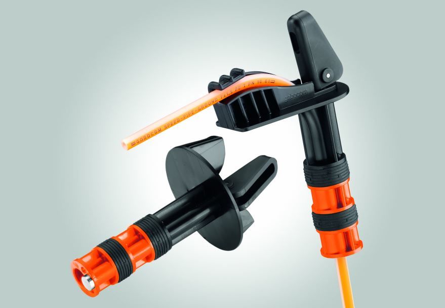 Nach dem Einblasvorgang wird das speedpipe ground in die integrierte Umlenkung eingeführt und die Kellerwand entlang geleitet. Das Produkt ist für eine Hauseinführung einfach für ein speedpipe-ground Ø7x1,5 durch eine Bohrung Ø28mm oder ein Futterrohr SKW 32 geeignet. Verkaufseinheit: 10 ST.
