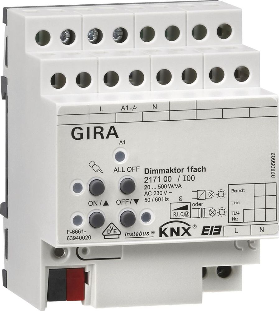 Dimmaktor 1fach für KNX 20 - 500 W VA REG plus Merkmale: Dimmaktor mit integrierter Busankopplung. Schalten und Dimmen von Glühlampen, HV-Halogenlampen, dimmbaren HV-LED-Lampen, dimmbaren Kompaktleuchtstofflampen, dimmbaren induktiven Trafos mit NV-Halogen- oder NV-LED-Lampen, dimmbaren elektronischen Trafos mit NV-Halogen- oder NV-LED-Lampen. Automatische oder manuelle Auswahl des zur Last passenden Dimmprinzips. Leerlauf-, kurzschluss- und übertemperatursicher. Handbetätigung der Ausgänge unabhängig vom Bus (auch Baustellenbetrieb möglich). Der Dimmaktor 1fach kann auch als Drehzahlsteller zur Drehzahlsteuerung von Einphasen-Elektromotoren verwendet werden. Baustellenbetrieb: Ausgänge manuell bedienbar ohne Busspannung nur mit der Betriebsspannung. Funktionen: Unabhängige Ansteuerung der Dimmkanäle. Im Baustellenbetrieb sind die Ausgänge manuell bedienbar, ohne Busspannung, nur mit der Betriebsspannung. Zentrale Schaltfunktion zur Ansteuerung aller Dimmkanäle. Verzögerung für aktiv sendende Rückmeldungen nach Busspannungswiederkehr. Vorgabe der Lastart und Festlegung des Dimmprinzips möglich: Universal (mit automatischem Einmessvorgang), elektronischer Trafo NV-LED (kapazitiv Phasenabschnitt), konventioneller Trafo NV-LED (induktiv Phasenanschnitt), HV-LED (Phasenanschnitt) bzw. HV-LED (Phasenabschnitt). Rückmeldung 'Schalten' und 'Helligkeitswert'. Einstellung des dimmbaren Helligkeitsbereichs möglich. Dimmverhalten und Dimmkennlinien parametrierbar. Einschaltverhalten bei relativem Dimmbefehl parametrierbar. Lampenschonendes Ein- und Ausschalten. Automatische Einstellung und Skalierung des dimmbaren Helligkeitsbereichs bei Verwendung von Universal-Leistungszusätzen. Das Verhalten eines Dimmkanals im Zustand 'AUS' beim Empfang eines relativen Dimmbefehls kann parametriert werden (Einschalten und Hochdimmen oder keine Reaktion). Meldetelegramme für Kurzschluss, Überlast und bei Lastausfall. Rückmelden der angeschlossenen Lastart. Sperrfunktion oder Zwangsstellungsfunktion für jeden Ausgang parametrierbar. Zeitfunktionen (Ein- bzw. Ausschaltverzögerung, Treppenlichtfunktion). Treppenlichtfunktion mit Vorwarnfunktion durch zeitgesteuertes Reduzieren der Beleuchtung oder Aktivierung einer Permanentbeleuchtung. Verknüpfungsfunktion und bis zu acht Szenen pro Dimmkanal möglich. Betriebsstundenzähler zum Erfassen der Einschaltzeit. Reaktionen bei Busspannungsausfall und -wiederkehr einstellbar. Hinweise : Leistungserweiterung durch Gira Leistungszusätze. Montage auf DIN-Hutschiene. VDE-Zulassung gemäß EN 60669-1, EN 60669-2-1.