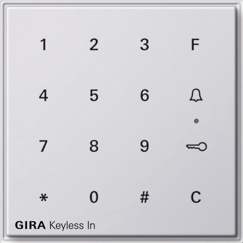 (IP 44) Reinweiss Codetastatur als Zutrittskontrollsystem basierend auf einem kapazitiv wirkenden und damit verschleissfreien Tastenfeld. Die Codetastatur hat folgende Produktmerkmale: - Installation in der 58er Unterputzdose. - Kapazitives Tastenfeld. Zur Codeeingabe ist eine leichte Annaeherung bzw. Beruehrung der Ziffer ausreichend. Aufgrund der verschleissfreien kapazitiven Technologie keine erkennbaren Abnutzung haeufig benuzter Ziffernkombination. - Ermoeglicht als Stand-Alone-Geraet oder in Kombination mit dem Gira Tuerkommunikations-System eine komfortable Ansteuerung zur Tueroeffnung fuer berechtigte Personen sowie ein Tuerrufsystem fuer Gebaeude mit mehreren Wohneinheiten. - Beim Stand-Alone-Betrieb werden die im UP-Einsatz vorhandenen potentialfreien Relaiskontakte fuer die Schalthandlungen genutzt, z.B. fuer Tueroeffner mit eigener Spannungsversorgung (z.B. handelsueblicher Klingeltrafo). - Sondertaste C": Loeschen einer Falscheingabe. - Sondertaste "Schluessel": Nach Eingabe des richtigen Codes erfolgt bei Tastenbetaetigung eine direkte Tueroeffnung. - Sondertaste "Glocke": Gezielte Anwahl von Wohnungsstationen in grossen Objekten. - Sondertaste "F: In Verbindung mit Schaltaktoren 1211 00, 1289 00 des Gira Tuerkommunikations-Systems sind hiermit Schaltfunktionen moeglich. - Integration in das Gira Tuerkommunikations-System ohne weitere Systemkomponenten. - Inbetriebnahme durch Direkt-Konfiguration am Geraet moeglich - die Codetastatur wird ohne PC oder Programmiersoftware in Betrieb genommen. - Homogene blaue LED-Ausleuchtung der Ziffern und Sonderzeichen bei Nacht. - Designvielfalt durch Integration in die Gira Designplattformen TX_44, System 55. Integration in Flaechenschalter und Edelstahl Serie 20, Serie 21 ueber Adapterrahmen moeglich. - Master PIN-Nummer auf beiliegender versiegelter Sicherheitskarte bei Verlust der Administrator-PIN-Nummer. - Die Codetastatur kann bis zu 255 Codes verwalten. - Bis zu 32stellige Codes moeglich. - Akustische Rueckmeldung bei Tastenbetaetigung. - Dreifarbige LED- Zustandsanzeige zur optischen Signalisierung bei der Programmierung und waehrend der Bedienung. - Warnton bei unberechtigter Entnahme des Tastaturaufsatzes zur Sabotageerkennung. In Verbindung mit dem Gira Tuerkommunikations-System laesst sich auch eine Sabotageschaltung mittels Schaltaktor realisieren. - Den beiden integrierten Wechsler-Relais koennen zwei unterschiedliche Codes zugeordnet werden, z.B. Code 1: Tueroeffnung, Code 2: Schalten des Aussenlichtes.Ein- und Ausgaenge - Schaltkontakt: 2 Relais mit potentialfreien Wechsler-Kontakten - Belastbarkeit 24 V / 1,6 A AC/DC - Steckerleiste Systembus Gira Tuerkommunikations-System - 2 Anschluesse Zusatzversorgung Schutzart: