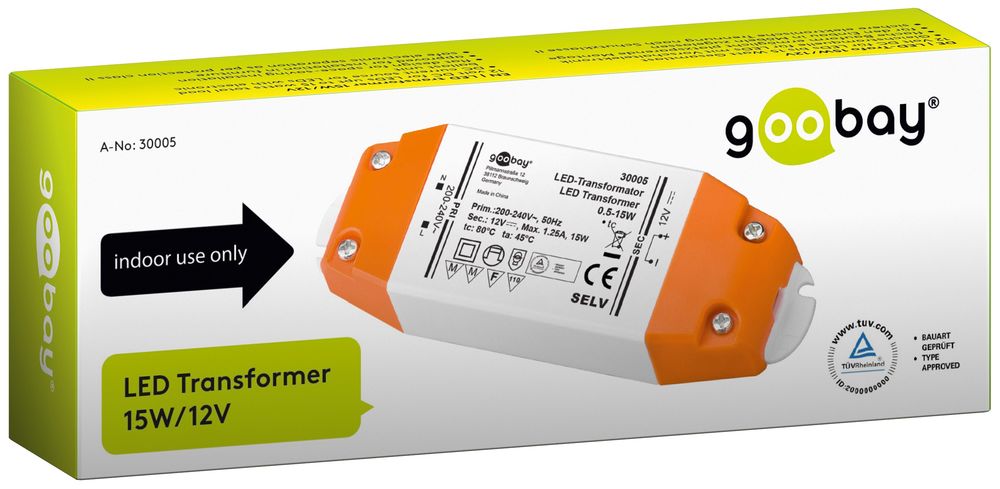 Goobay 30005 LED-Trafo 15W/12V - 12 Volt DC für LEDs bis 15 Watt Gesamtlast bieten wir Ihnen immer zum bestmöglichen Preis an. Einen Rabatt von 2% auf Goobay 30005 LED-Trafo 15W/12V - 12 Volt DC für LEDs bis 15 Watt Gesamtlast können wir Ihnen gewähren, wenn Sie bei der Bestellung die Zahlungsart Vorkasse wählen.