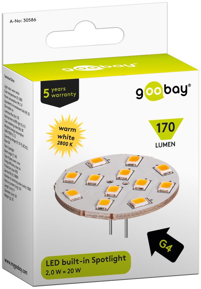 Goobay 30586 LED Einbaustrahler, 2 W - Sockel G4, ersetzt 20 W bieten wir Ihnen immer zum bestmöglichen Preis an. Einen Rabatt von 2% auf Goobay 30586 LED Einbaustrahler, 2 W - Sockel G4, ersetzt 20 W können wir Ihnen gewähren, wenn Sie bei der Bestellung die Zahlungsart Vorkasse wählen.