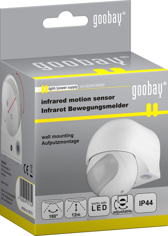 Der Artikel Goobay 95174 Bewegungsmelder - Aufputzmelder zur Verwendung im Innen- und Außenbereich ist derzeit auf Lager