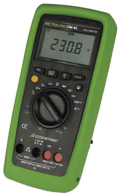 Digital-Multimeter mit Temperaturmessung. Das METRALINE DM41 bietet alle Messfunktionen eines vielseitigen Multimeters der Mittelklasse: Überzeugende Technik mit Spannungs-, Widerstands-, Strom- und Temperaturmessbereichen und vielen weiteren Mess- und Automatikfunktionen, z.B. Frequenz- und Tastverhältnismessung.. Das Digital-Multimeter mit einem hervorragenden Preis-Leistungsverhältnis. Erprobte Gossen Metrawatt Zuverlässigkeit und Sicherheit. Sichere Messergebnisse in den Messkategorien CAT IV 300V bzw. CAT III 600V mit einem plus an Sicherheit für Anwender und Gerät Dank automatischer Buchsensperre (ABS). Das robuste Digital-Multimeter METRALINE DM41 bietet vielfältig überzeugende Leistungsmerkmale. Es ist mit modernster Technik ausgestattet und gewährleistet präzise Messergebnisse. Das äußerst kompakte und ergonomische Design sorgt für ein Maximum an Bedienungsfreundlichkeit und Sicherheit. Dank breitem Funktionsspektrum ist es universell geeignet für anspruchsvolle Messaufgaben in vielen Anwendungsbereichen. . Frequenzbereich bis 1 kHz Tastverhältnismessung Automatische Buchsen-Sperre ABS . Universell einsetzbar in allen Bereichen der Elektrotechnik! 4000 Digits Digitalanzeige Messung von Spannung und Strom, AC und DC, Widerstand, Temperatur, Frequenz, Tastverhältnis, Kapazität, Durchgang / Dioden Automatische Messbereichswahl und Messwertspeicherung Sicherheit für den Anwender und das Gerät in den Messkategorien CAT III bis 600V und CAT IV bis 300V. . Das Autorange-Multimeter für den Einsatz in allen Bereichen der Elektrotechnik, z.B. in der Elektroinstallation, im Studium oder in der Ausbildung.. Auflösung: 4000 Digits (3 3/4 stellig) Digitalanzeige mit Hintergrundbeleuchtung Grundgenauigkeit: 0,5% VDC Spannung: VDC 100 µV .. 600 V und VAC 100 µV .. 600 V Strom: ADC 10 µA ...10 A und AAC 10 µA ...10 A Widerstand: 100 m¿ ...40 M¿ Temperatur: -50...+1.300°C Thermoelement Typ K Frequenzmessung: 0,001 Hz ...500,0 kHz Tastverhältnismessung: 1% ..98,9% (1 kHz) Kapazitätsmessung: 1 pF ...200,0 microF Durchgangs- und Diodentest Hold / Spitze / Min-Max / relativ (Null) Automatische / manuelle Messbereichswahl Automatische Buchsen-Sperre ABS Messkategorie 300 V CAT IV, 600 V CAT III Gummischutzhülle zum Schutz gegen Stoss und Schlag 3 Jahre Garantie . 36 Monate Garantie auf Material- und Fabrikationsfehler. 1 x Digital-Multimeter 1 x Gummischutzhülle 2 x 1,5 V-Mignonzellen 1 x Messkabelsatz 1 x Kurzbedienungsanleitung