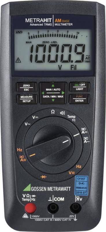 TRMS Universal-Multimeter mit 12.000 Digits Digitalanzeige und Clip-Funktion. Das METRAHIT AM BASE ist ein Universalmultimeter der METRAHIT Advanced Multimeter Serie.Die Multimeter der METRAHIT AM Serie: METRAHIT AM BASE, PRO, TECH und XTRA sind absolut robuste und zuverlässige Digitalmultimeter mit Gehäusen aus schlagfestem Kunststoff. Die Geräte präsentieren sich in attraktivem Design und mit der neuesten Technik.. Das METRAHIT AM BASE ist ein Universalmultimeter der METRAHIT Advanced Multimeter Serie mit Clip Funktion zur Strommessung mit Sensoren.Spitzentechnik bis ins Detail: Die robusten Digital-Multimeter der METRAHIT AM Serie bieten in jeder Hinsicht überzeugende Leistungsmerkmale. Sie sind mit modernster Technik ausgestattet und gewährleisten hochpräzise Ergebnisse. Ihr ergonomisches Design sorgt für ein Maximum an Bedienungsfreundlichkeit und Sicherheit. Mit ihrem breiten Funktionsspektrum sind sie für anspruchsvolle Messaufgaben in vielen Bereichen optimal geeignet.. TRMSAC, AC+DC Messung bis 1 kHzStrommessung mit Stromsensoren und Clip Funktion zum einstellen des Übersetzungsverhältnisses. Universell einsetzbar in allen Bereichen der Elektrotechnik! Echteffektivwertmessung bis 1 kHz mit 12.000 Digits Digitalanzeige und AnalogskalaMessung von Spannung, DC, AC und ACDC, Widerstand, Temperatur, Frequenz, Durchgang / DiodenClip Funktion für die Strommessung mit StromsensorenAutomatische Messbereichswahl und MesswertspeicherungSicherheit für den Anwender und das Gerät in den Messkategorien CAT IV bis 600V und CAT III bis 1000V.. Das Multimeter eignet sich für den universellen Einsatz in der Elektrotechnik, in den Bereichen Elektroinstallation, Labor, Fernmeldewesen, Schulung, usw. Dank hochohmigem Messeingängen und Clip-Funktion für Stromsensoren insbesondere für Energieversorger.Das Gerät ist feldtauglich und besitzt eine interne netzunabhängige Stromversorgung.. 12 Multimeterfunktionen Auflösung ±12.000 Digits, 4½ stellig Grundgenauigkeit ±0,05 % (VDC) Spannung ACTRMS, Spannung AC+DC TRMS , Spannung DC, Frequenz (Hz, kHz), Widerstand, Diodentest, Durchgangstest, Temperatur mit K-Thermoelementen Automatische und manuelle Messbereichswahl Automatische Messwertspeicherung DATA / MIN / MAX großes, lichtblau beleuchtetes Display mit extra großen Ziffern (15mm) und analogem Bargraph für dynamische Vorgänge getrenntes Batterie- und Sicherungsfach Patentierte automatische Buchsen-Sperre ABS Messkategorie 600 V CAT IV, 1000 V CAT III. DAkkS Kalibrierschein inklusive36 Monate Garantie auf Material- und Fabrikationsfehler. 1 x Multimeter1 Paar Sicherheitsmessleitungen (1,5 m) mit 4-mm-Prüfspitzen, 1000 V CAT III, 600 V CAT IV (KS17-2)2 x Batterien 1,5 V, Typ AA1 x Kurzbedienungsanleitung in Deutsch/Englisch1 x CD-ROM, Inhalt: Bedienungsanleitung in Deutsch und Englisch1 x DAkkS-Kalibrierschein