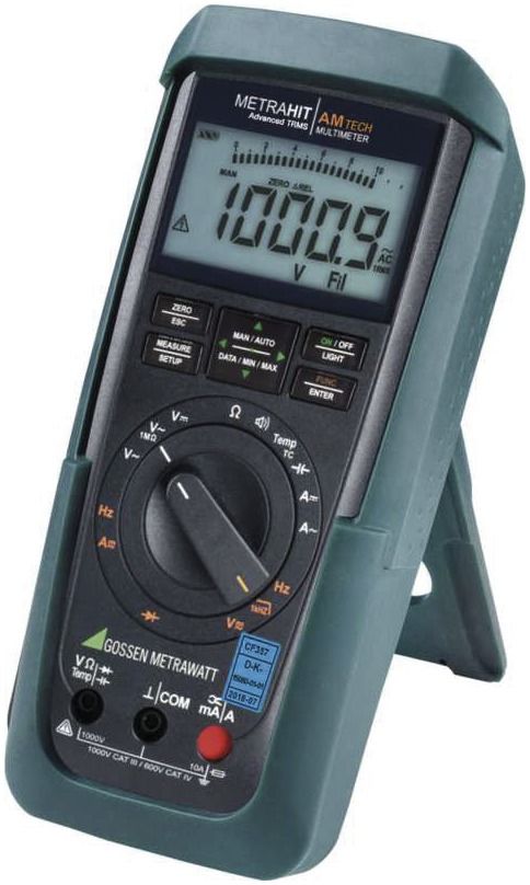 TRMS Universal-Multimeter mit 12.000 Digits Digitalanzeige und für Messumformer optimierten Strommessbereichen. Das METRAHIT AM TECH mit Gummischutzhülle ist ein Universalmultimeter der METRAHIT Advanced Multimeter Serie. Die Multimeter der METRAHIT AM Serie: METRAHIT AM BASE, PRO, TECH und XTRA sind absolut robuste und zuverlässige Digitalmultimeter mit Gehäusen aus schlagfestem Kunststoff. Die Geräte präsentieren sich in attraktivem Design und mit der neuesten Technik. . Das METRAHIT AM TECH ist ein Universalmultimeter der METRAHIT Advanced Multimeter Serie mit Strommessbereichen optimierte für Messungen an Messumformern in der Prozessindustrie.Spitzentechnik bis ins Detail: Die robusten Digital-Multimeter der METRAHIT AM Serie bieten in jeder Hinsicht überzeugende Leistungsmerkmale. Sie sind mit modernster Technik ausgestattet und gewährleisten hochpräzise Ergebnisse. Ihr ergonomisches Design sorgt für ein Maximum an Bedienungsfreundlichkeit und Sicherheit. Mit ihrem breiten Funktionsspektrum sind sie für anspruchsvolle Messaufgaben in vielen Bereichen optimal geeignet.. TRMSAC, AC+DC Messung bis 10 kHz für Spannung und Stromdirekte Strommesung mit erhöhter Genauigkeit 0,1% für Messungen an MessumformernWeitbereichs-Kapazitätsmessung. Universell einsetzbar in allen Bereichen der Elektrotechnik! Echteffektivwertmessung bis 10 kHz mit 12000 Digits Digitalanzeige und AnalogskalaMessung von Spannung und Strom, DC, AC und ACDC, Widerstand, Kapazität, Temperatur, Frequenz, Durchgang / DiodenClip Funktion für die Strommessung mit Wandlern und SensorenAutomatische Messbereichswahl und MesswertspeicherungSicherheit für den Anwender und das Gerät in den Messkategorien CAT IV bis 600V und CAT III bis 1000V.. Das Multimeter eignet sich für den universellen Einsatz in der Elektrotechnik, in den Bereichen Elektroinstallation, Labor, Fernmeldewesen, Schulung, usw. Dank Strommessbereichen mit erhöhter Genauigkeit eigenet es sicher besonders für Messungen an Messumformern in der Prozessindustrie.Das Gerät ist feldtauglich und besitzt eine interne netzunabhängige Stromversorgung.. 20 MultimeterfunktionenAuflösung ±12.000 Digits, 4½ stelligGrundgenauigkeit ±0,05 % (VDC)Spannung ACTRMS, Spannung AC+DC TRMS , Spannung DC, Frequenz (Hz, kHz), Widerstand, Diodentest, Durchgangstest, Kapazität, Strom ACTRMS, Strom AC+DCTRMS, Temperatur mit K-ThermoelementenAutorange Strommessung von 1 mA bis 10 A (16A) über eine Buchse und eine SicherungClip Funktion für die Strommessung mit Wandlern und SensorenZusätzliche Filterfunktion und Spannungsmessung mit verringertem Eingangswiderstand zur Störbegrenzung, z.B. bei Messungen an FrequenzumrichternAutomatische und manuelle MessbereichswahlAutomatische Messwertspeicherung DATA / MIN / MAXgroßes, lichtblau beleuchtetes Display mit extra großen Ziffern (15mm) und analogem Bargraph für dynamische Vorgängegetrenntes Batterie- und SicherungsfachPatentierte automatische Buchsen-Sperre ABSMesskategorie 600 V CAT IV, 1000 V CAT III. DAkkS Kalibrierschein inklusive36 Monate Garantie auf Material- und Fabrikationsfehler. 1 x Multimeter 1 Paar Sicherheitsmessleitungen (1,5 m) mit 4-mm-Prüfspitzen, 1000 V CAT III, 600 V CAT IV (KS17-2) 1 x Gummischutzhülle GH18 mit Tragriemen 2 x Batterien 1,5 V, Typ AA 1 x Kurzbedienungsanleitung in Deutsch/Englisch 1 x CD-ROM, Inhalt: Bedienungsanleitung in Deutsch und Englisch 1 x DAkkS-Kalibrierschein